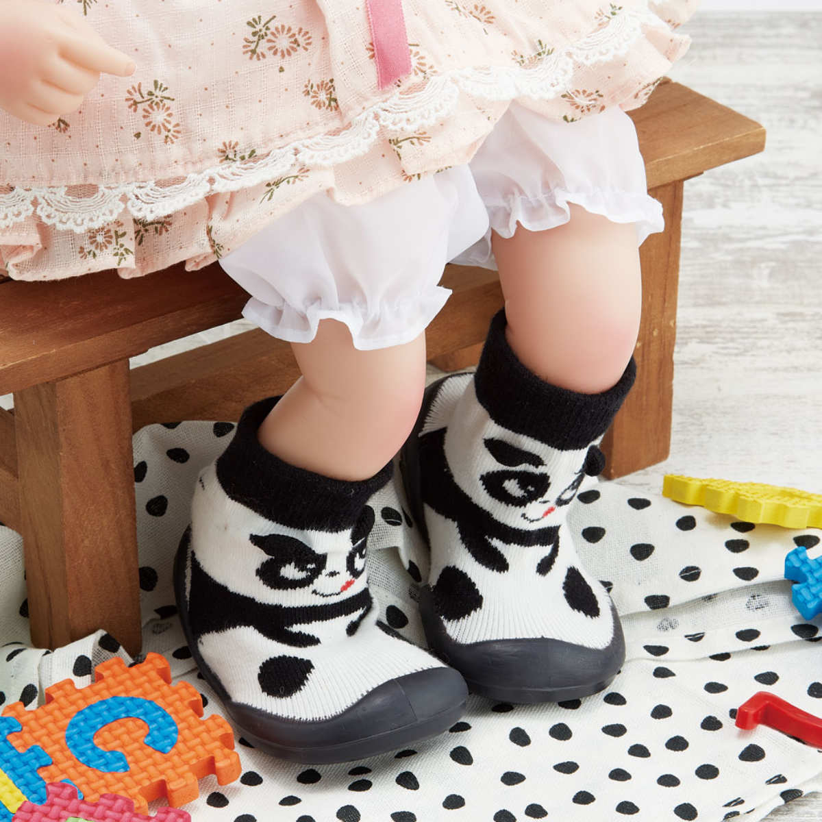 ●シューズの上部は靴下のように柔らかく伸縮性があり、赤ちゃんの足に優しくフィットします。