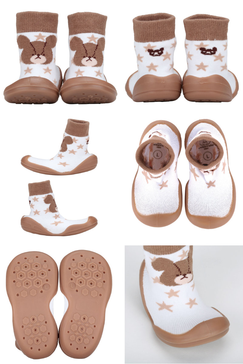 ●シューズの上部は靴下のように柔らかく伸縮性があり、赤ちゃんの足に優しくフィットします。