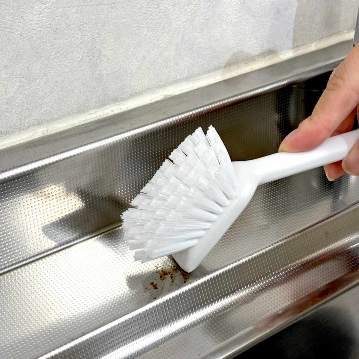シンクのコゲや落ちにくい汚れはブラシ先端のヘラでこそげ落とすことができ、ゴシゴシ洗う手間を減らせます。