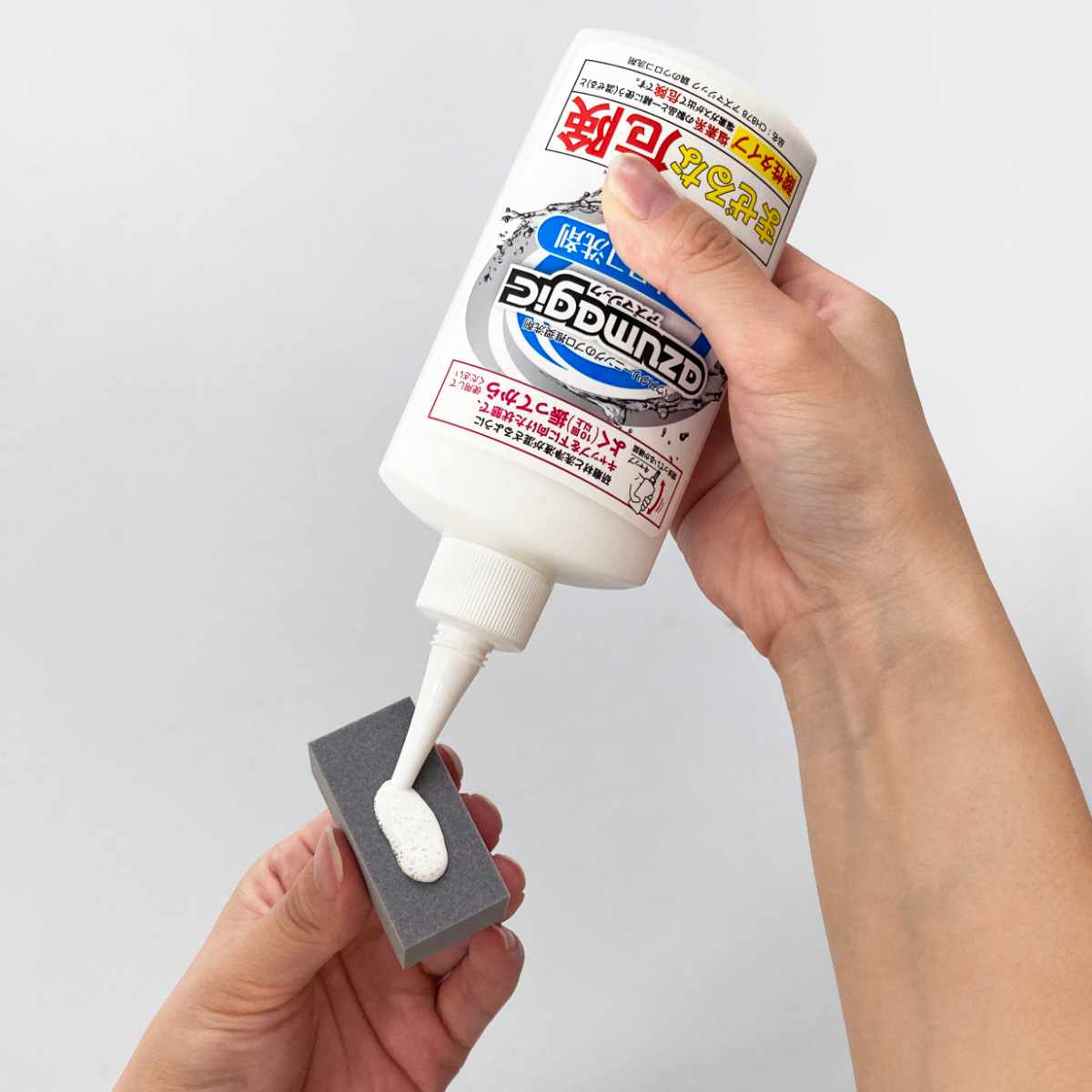 力を入れずに洗剤と研磨材の力でこびりついた汚れをスッキリ落とします。付属のスポンジを使うと、さらに効率よく掃除できます。