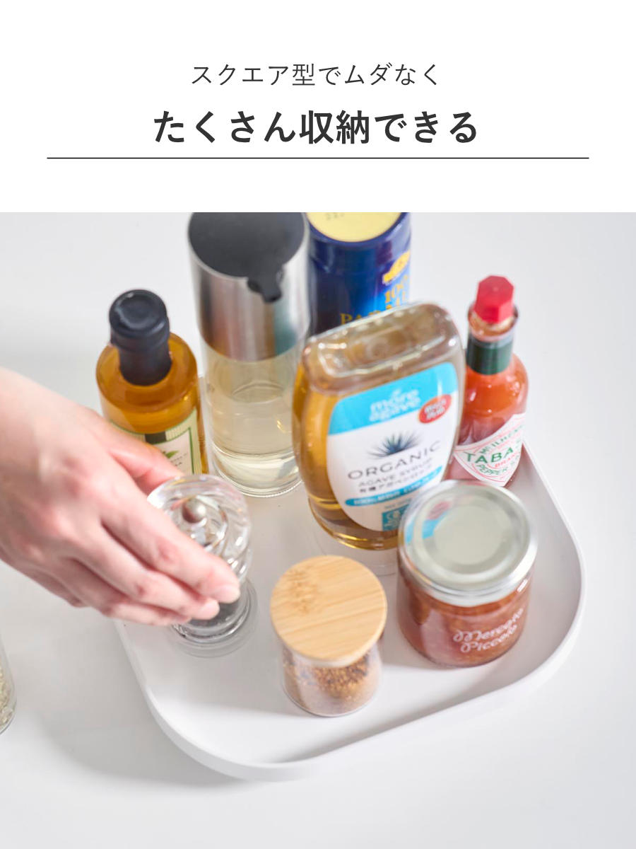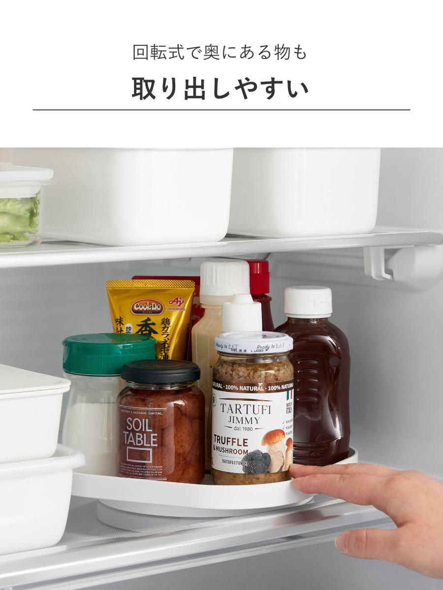 トレーの縁が浅い設計なので、冷蔵庫や棚の上段に置いても取り出しやすく、回転させることで奥にある物も楽に取り出すことができて便利です。