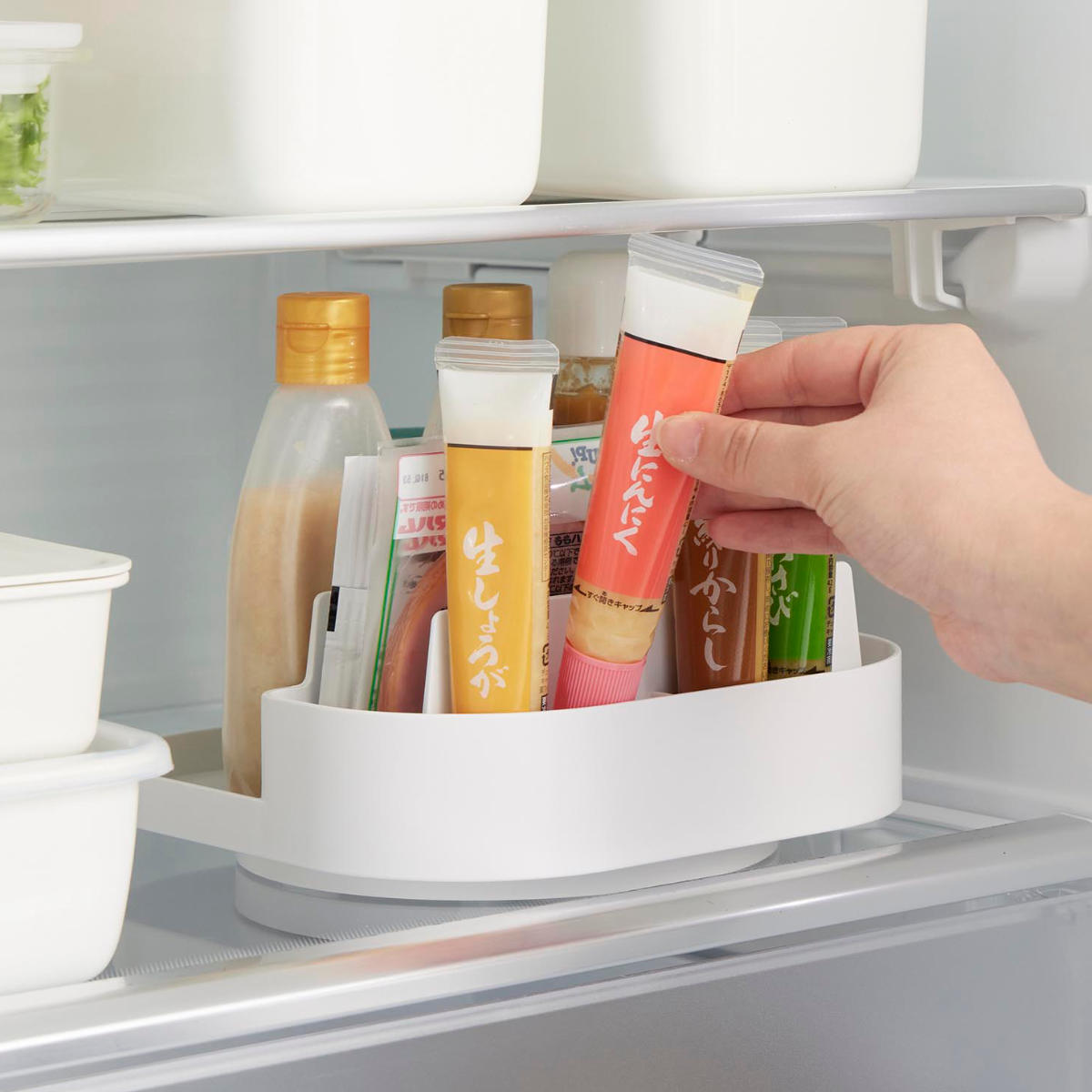 トレーの縁が浅い設計なので、冷蔵庫や棚の上段に置いても取り出しやすく、回転させることで奥にある物も楽に取り出すことができて便利です。