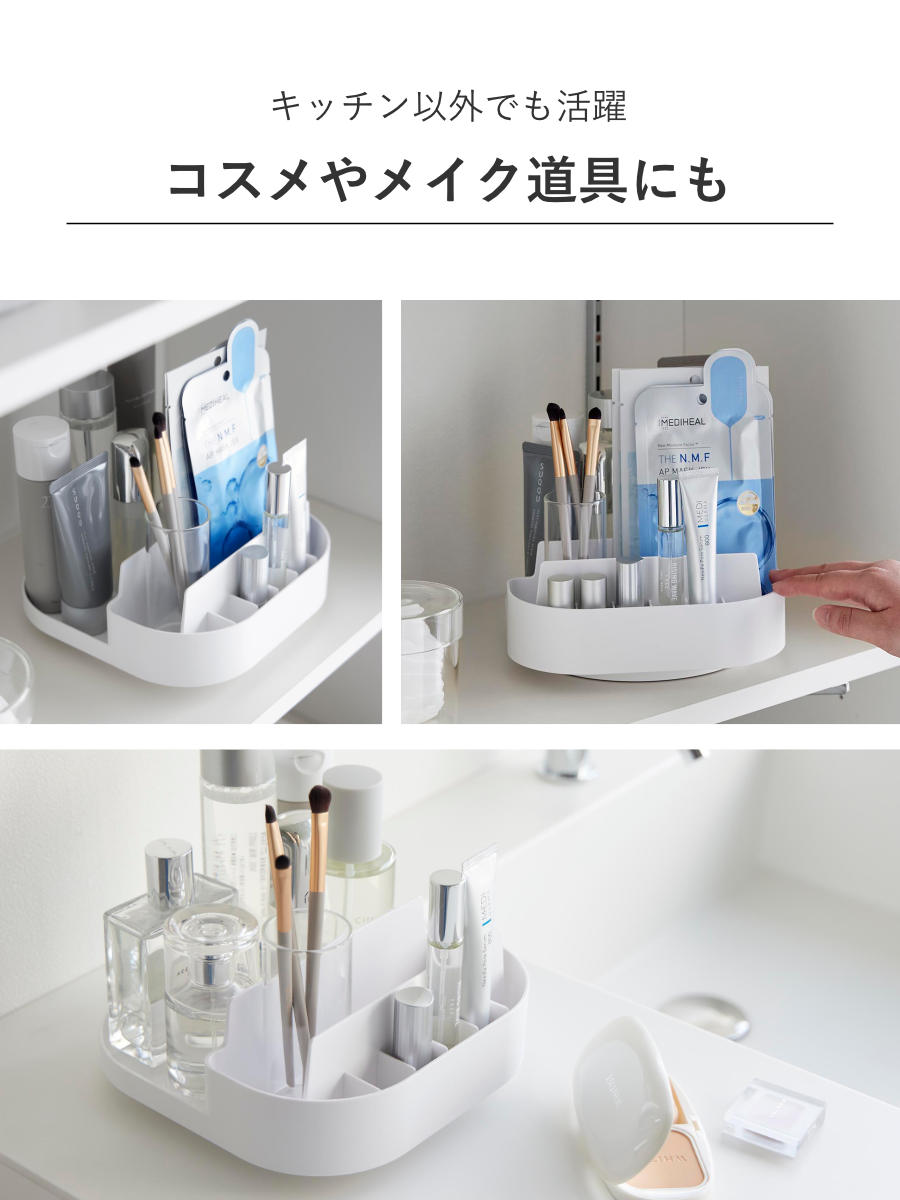 棚に収納したままでもクルッと回転して中のアイテムが取り出しやすく、取り出して使うのもOK。メイクが終わったらそのまま棚に戻すだけで、片付けも簡単。仕切り付きでごちゃつくアイテムの整理がしやすく、毎日の身支度がぐんとスムーズ。
