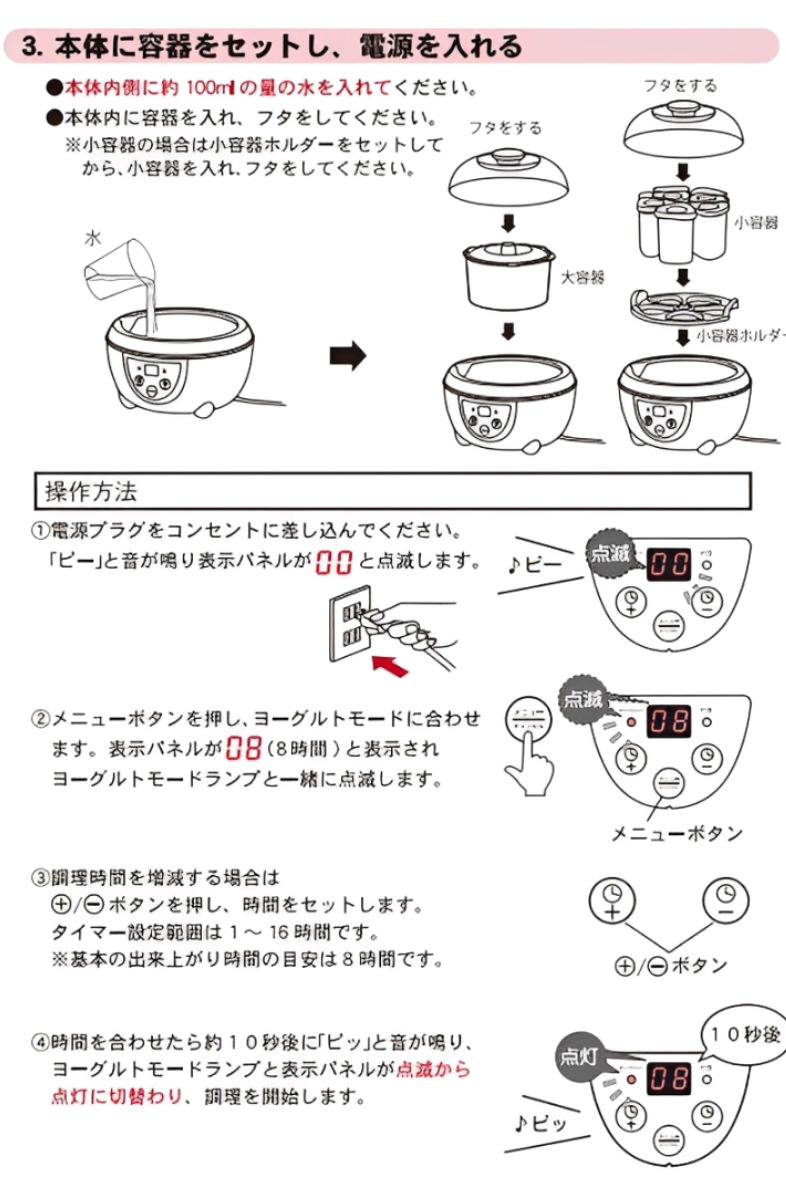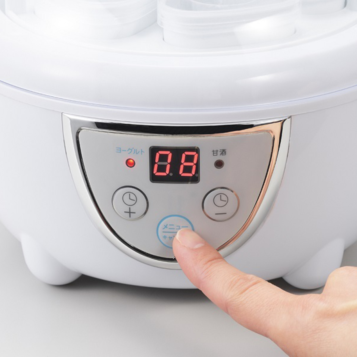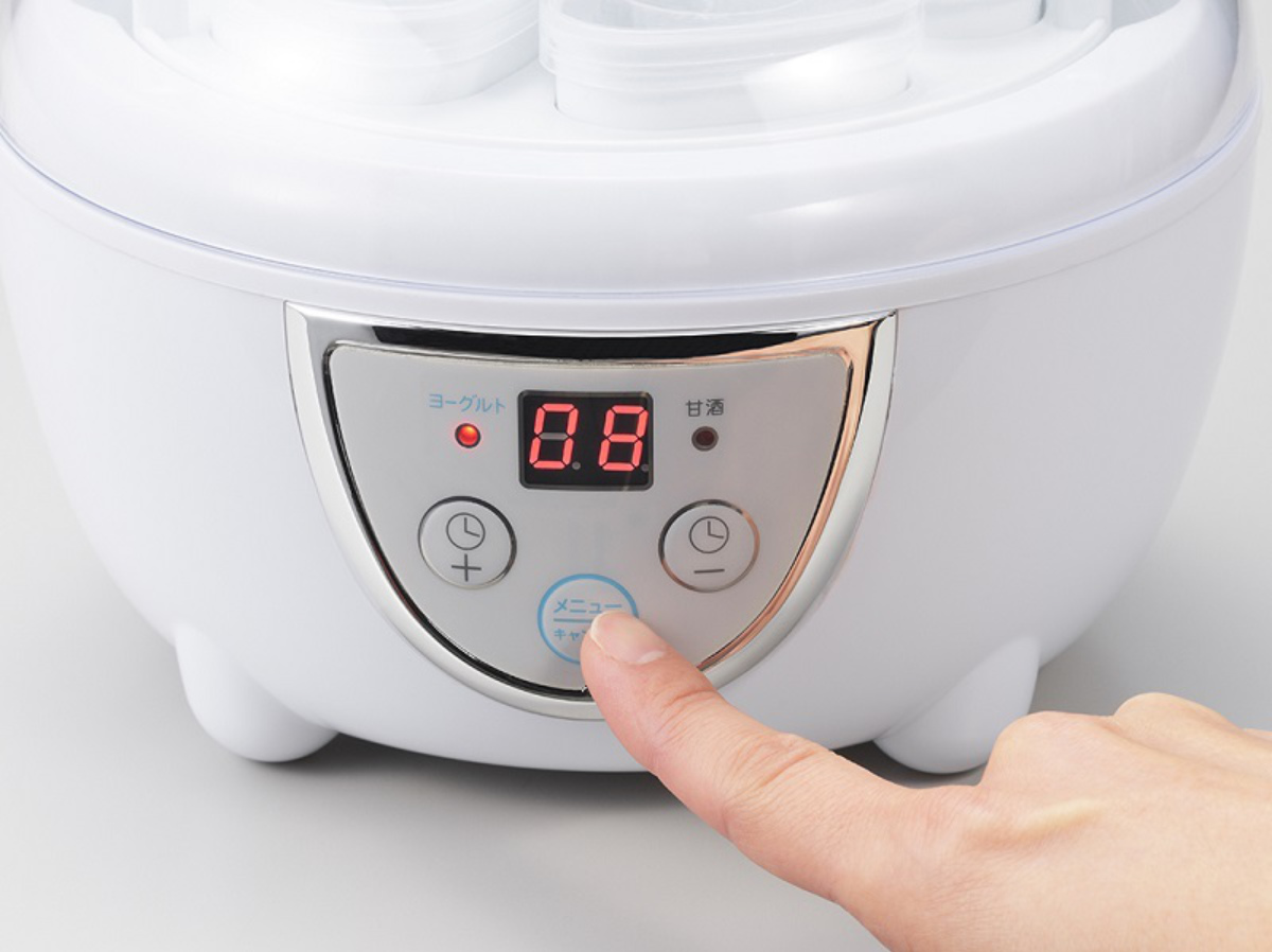 前面のメニューボタンで「ヨーグルト」「甘酒」モードを選択し、調理時間を設定できます。説明書付きなので、使用方法に沿って誰でもかんたんに作れます。