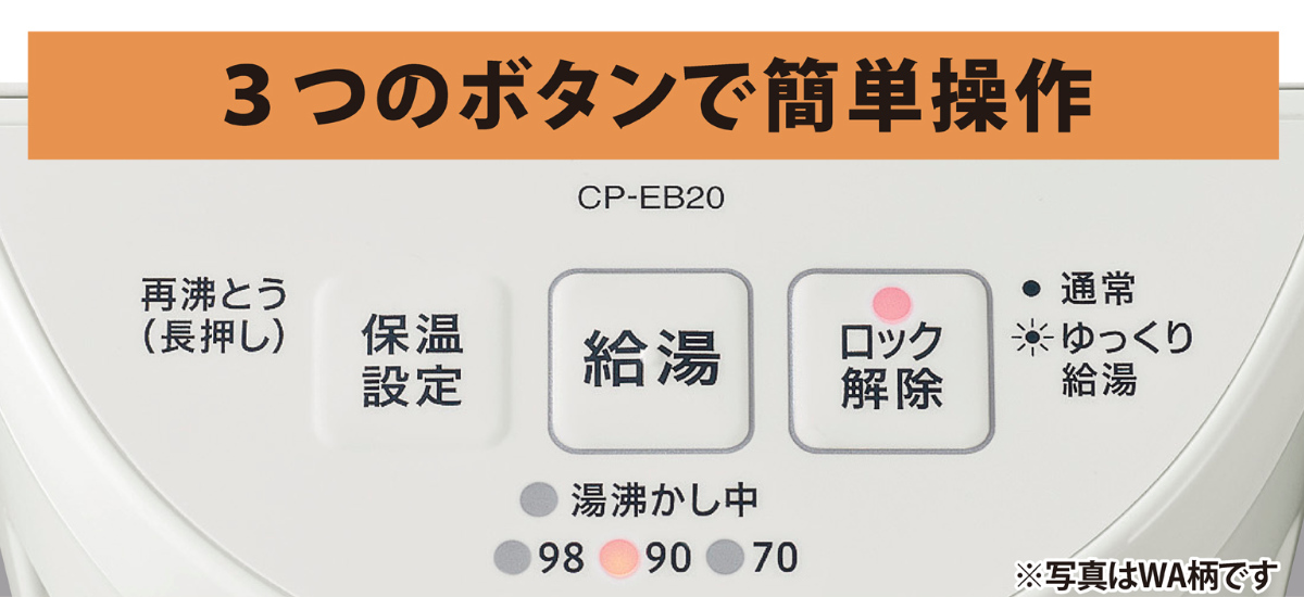 保温設定は98度・90度・70度から選択可能です。「70度保温」は、一度沸とうさせたお湯を70度で保温するので、ミルク作りに便利にお使いいただけます。