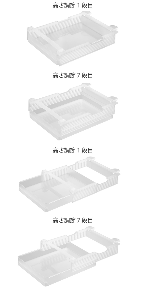 収納する物や隙間に合わせて高さを7段階に調節できる