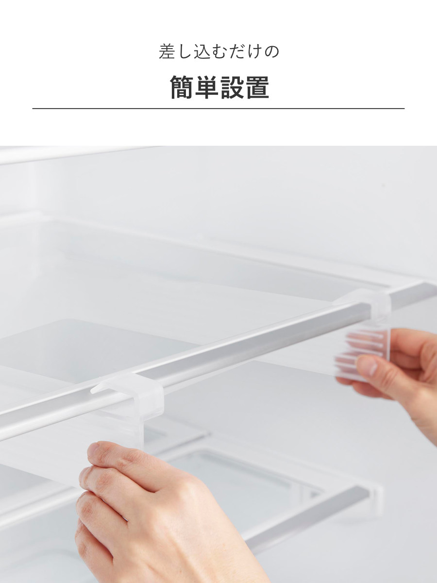 設置は、引っ掛け部を棚板に差し込み、吸盤で固定するだけの簡単仕様です。