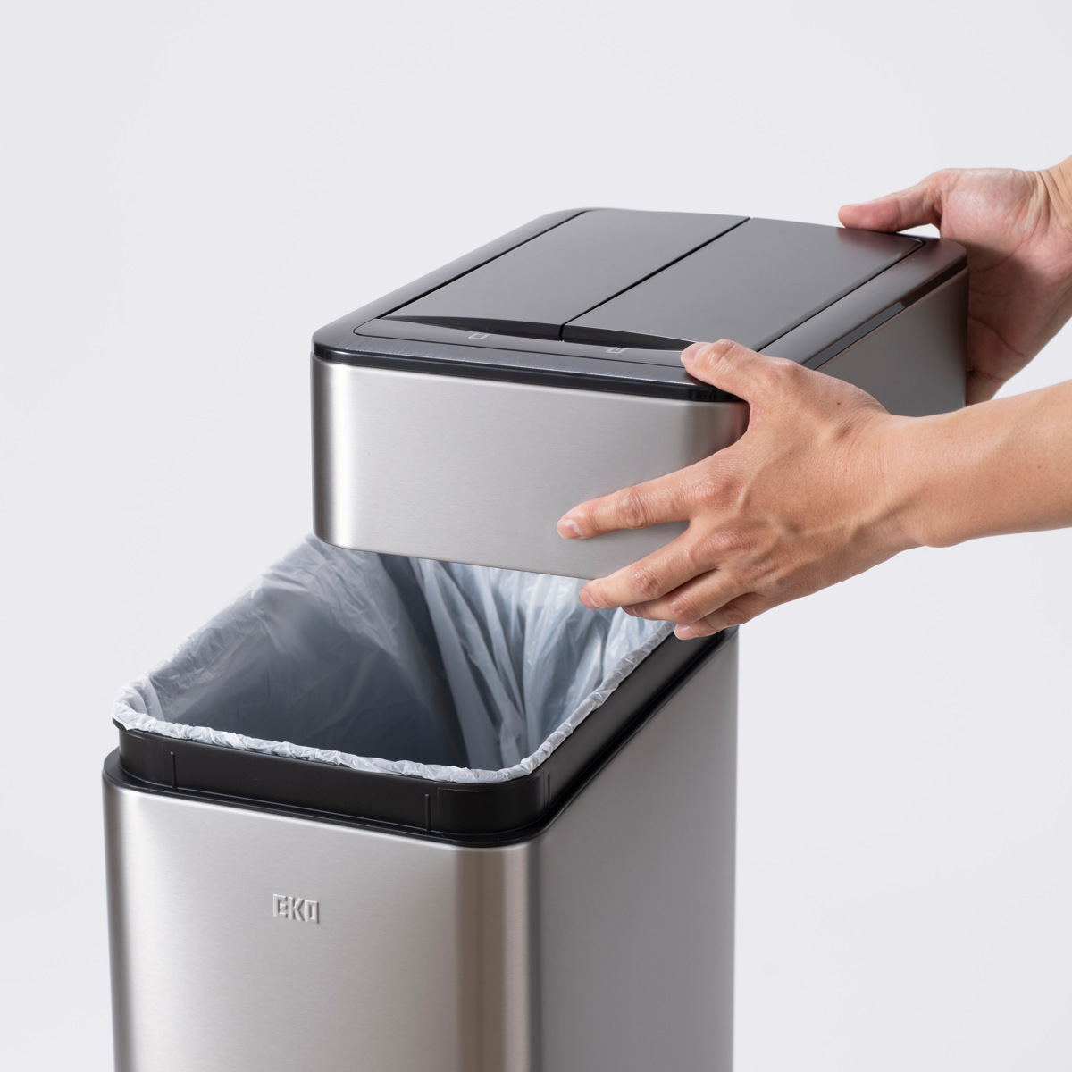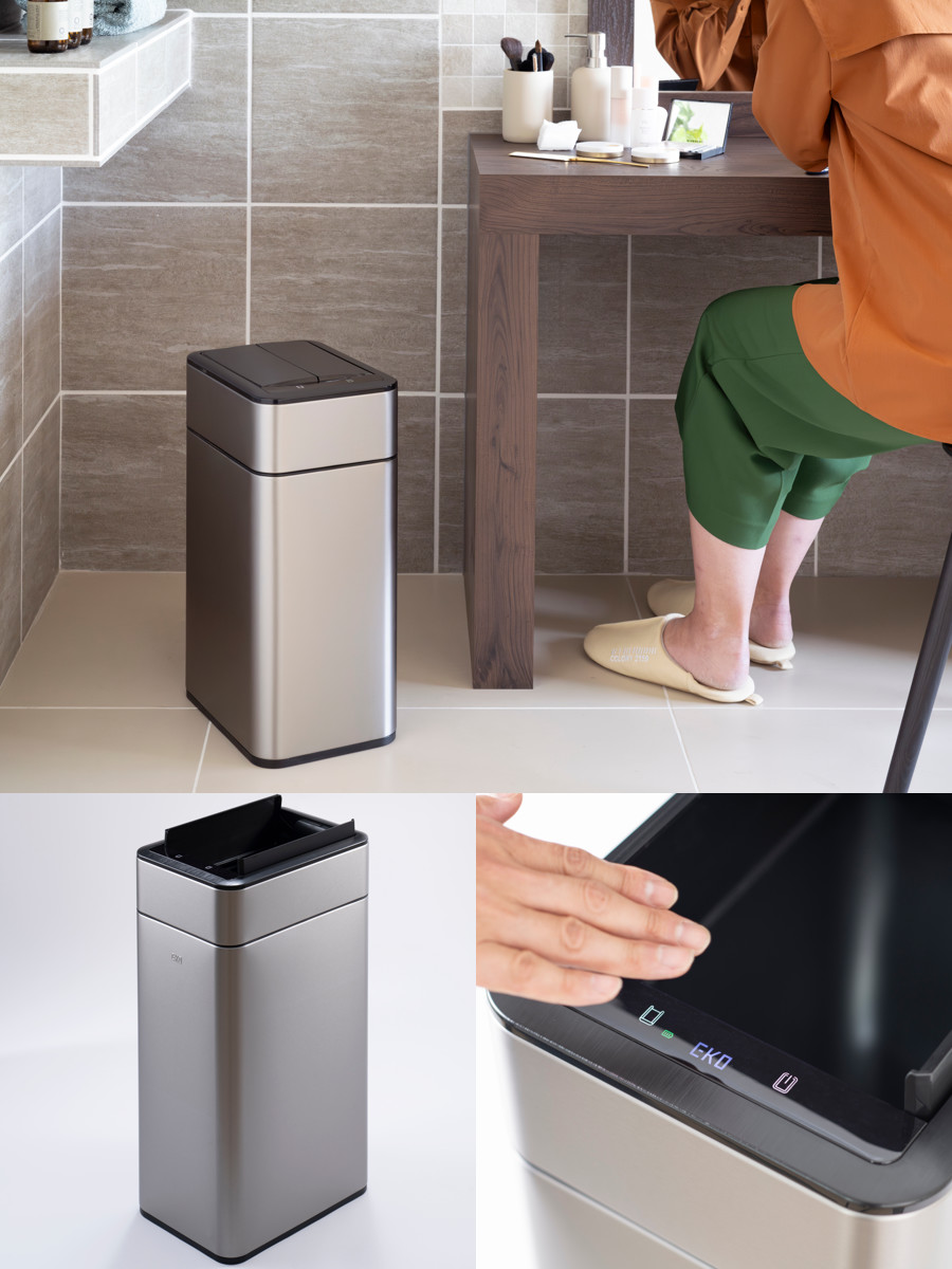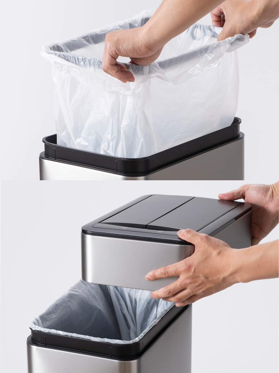 スプリットフラップ式のフタはコンパクトにゆっくりと開き、ゴミ箱の中に収納されます。上方のスペースを最小限に抑え、狭いスペースや棚下などの設置にも最適です。