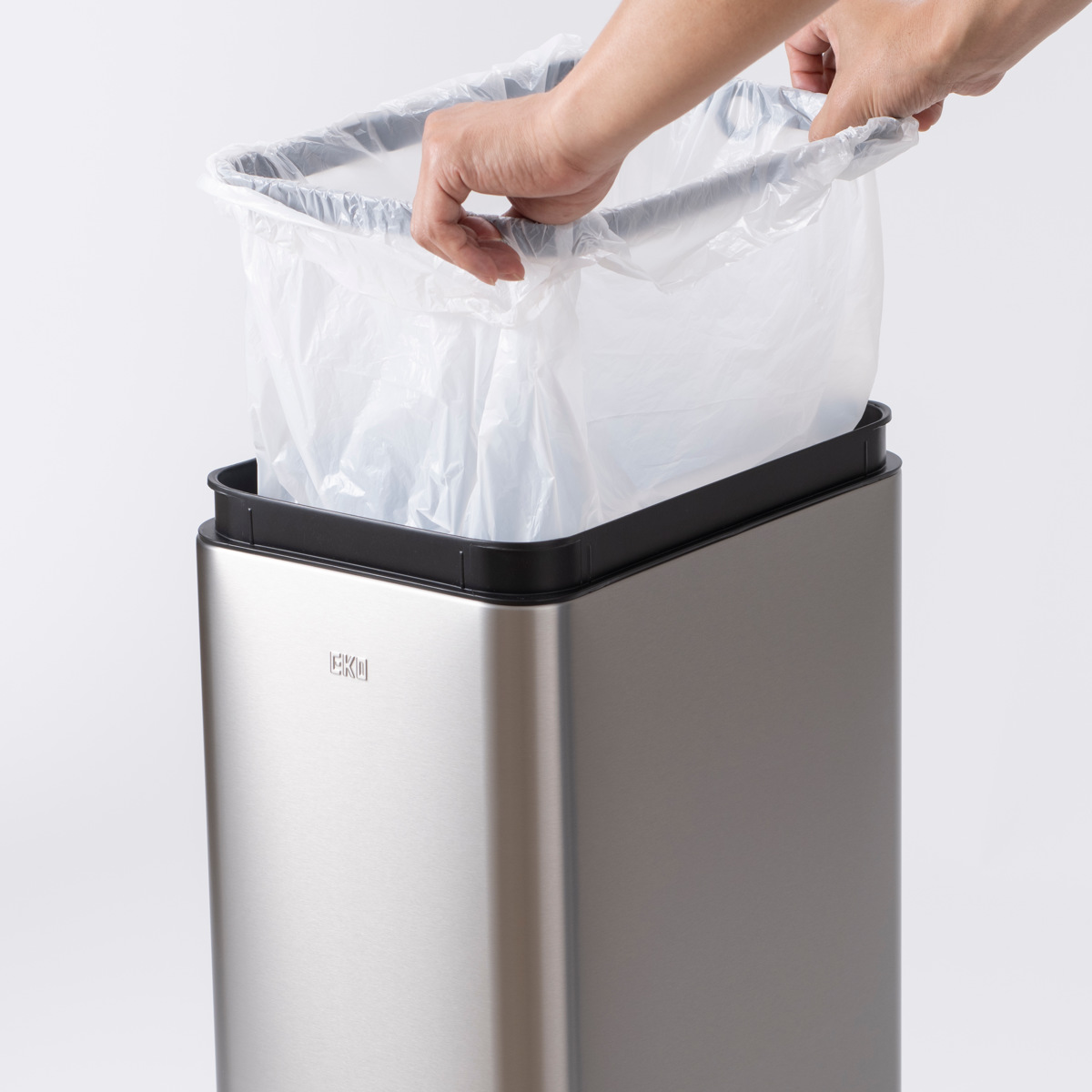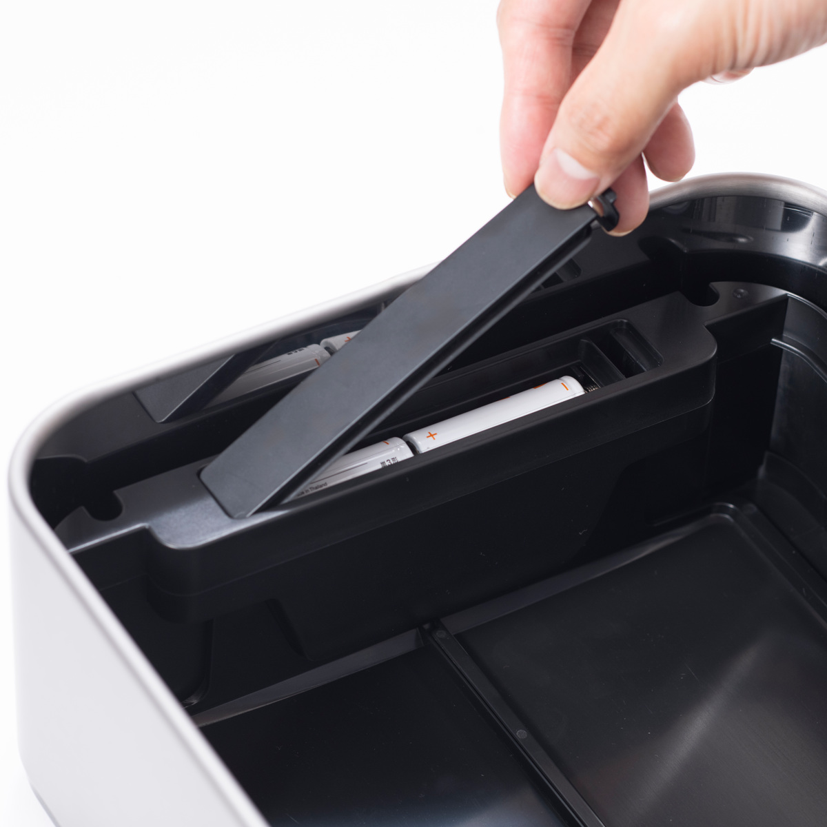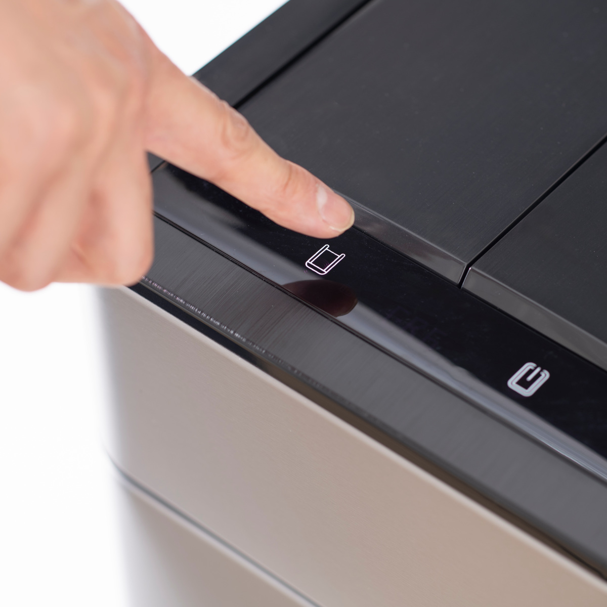 スプリットフラップ式のフタはコンパクトにゆっくりと開き、ゴミ箱の中に収納されます。上方のスペースを最小限に抑え、狭いスペースや棚下などの設置にも最適です。