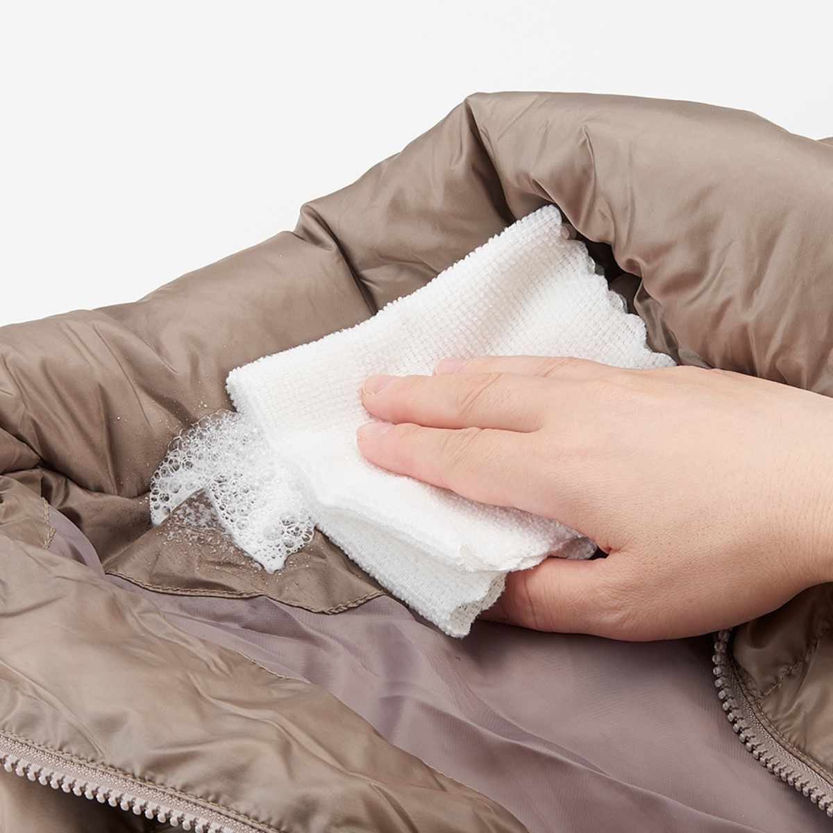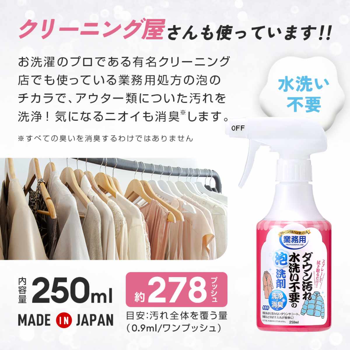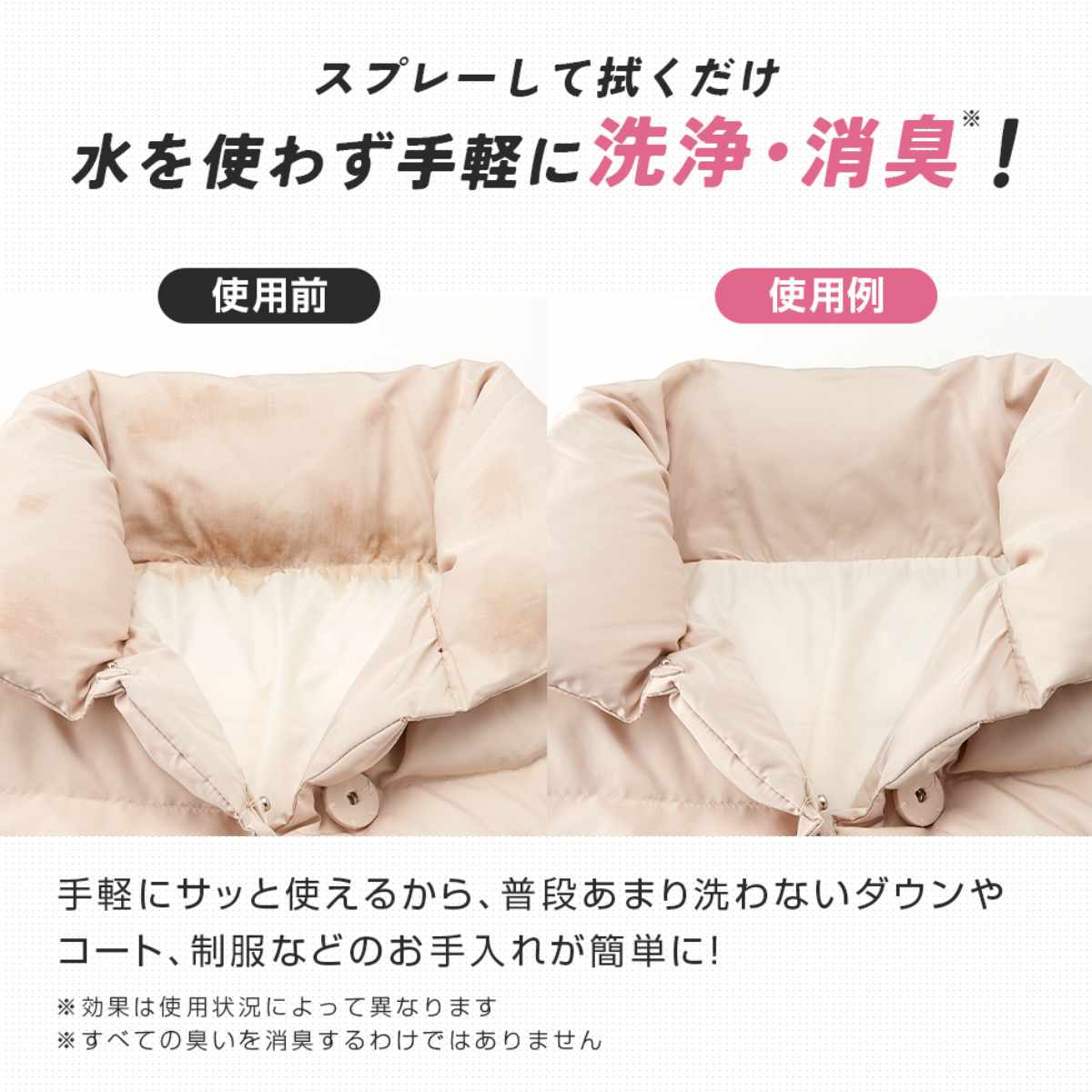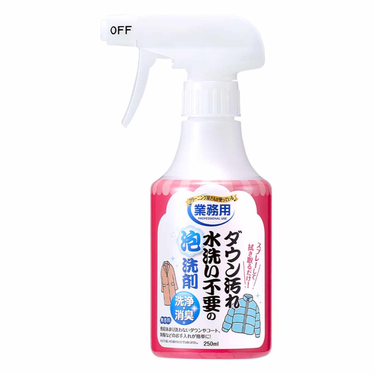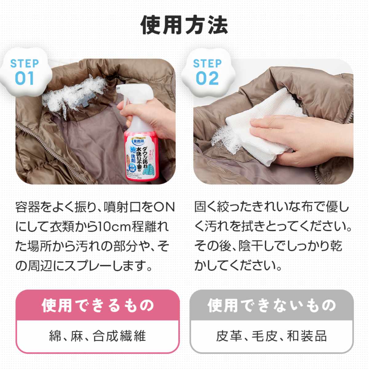 普段あまり洗わないダウンコートや制服などを簡単にお手入れできる洗剤です。スプレーを吹きかけて拭き取るだけで、しっかり汚れを落とします。