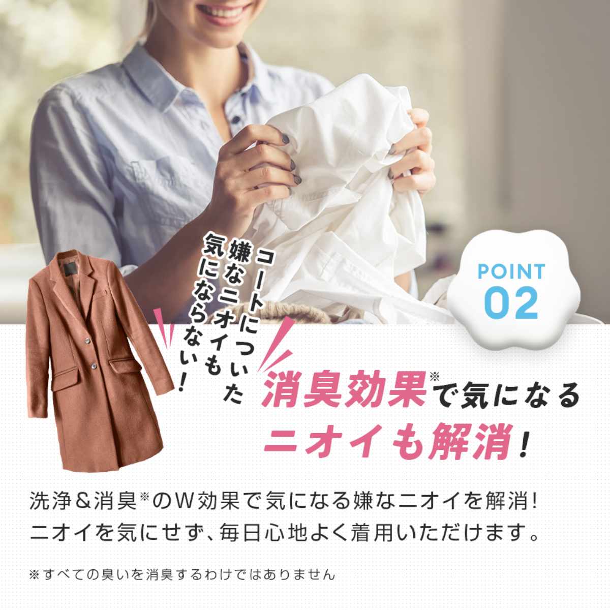 洗いにくいコートやジャケットも家でサッと手軽に洗浄できます。クリーニングに出さずに、汚れや気になるにおいをスッキリ落とせます。