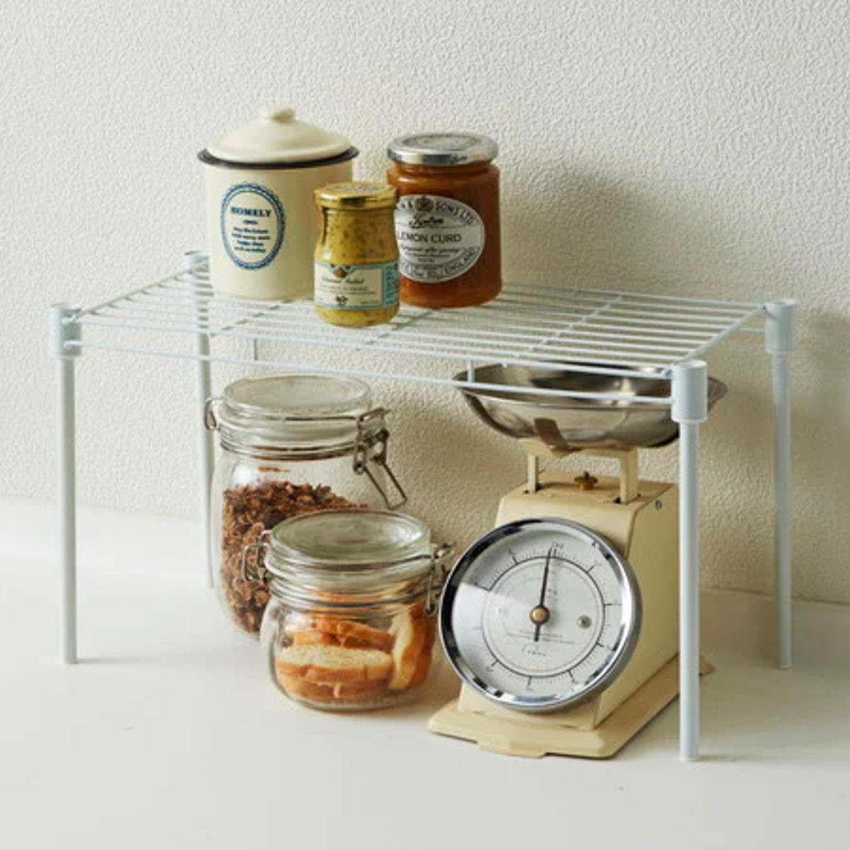 瓶や缶を置いても安定感があり、ぐらつかずにしっかり支えます。よく使う調味料や保存容器をまとめて置けるので、調理中の出し入れもスムーズです。
