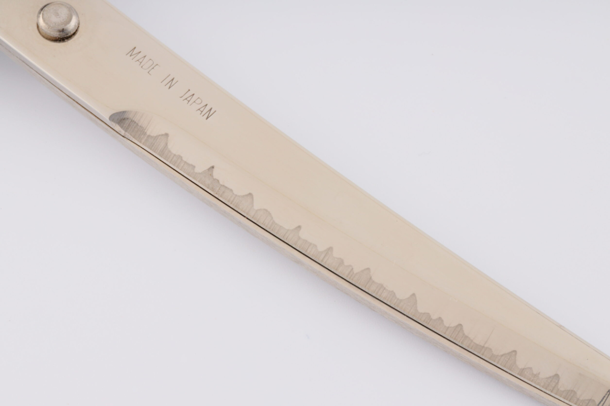 日本刀を忠実に再現した三本杉の刃紋入りです。刃体がカーブしており、硬いものを切っても逃さずスムーズにカットできます
