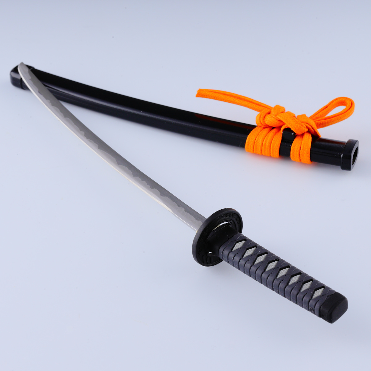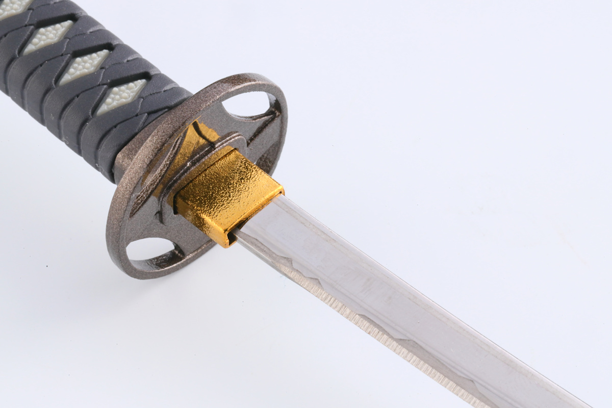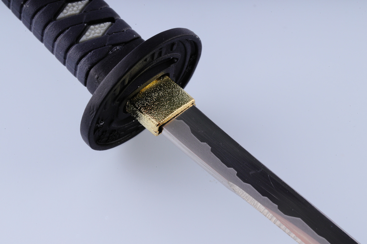 ・鞘は光沢のある黒色(紺交じり)。刃体には互の目乱れ刃紋入り。