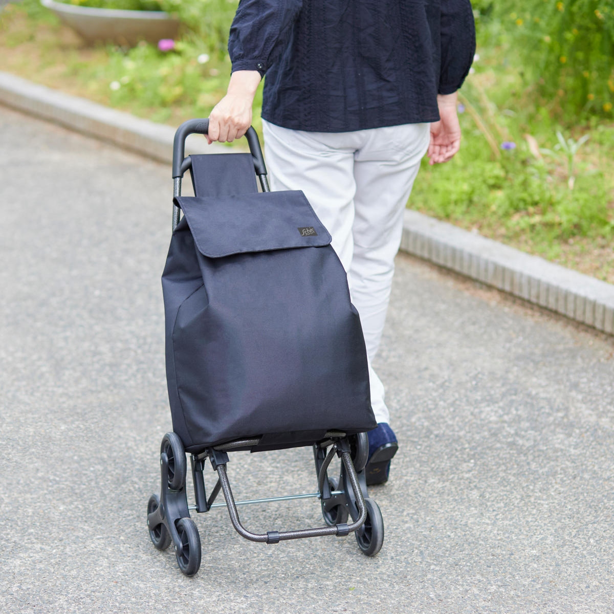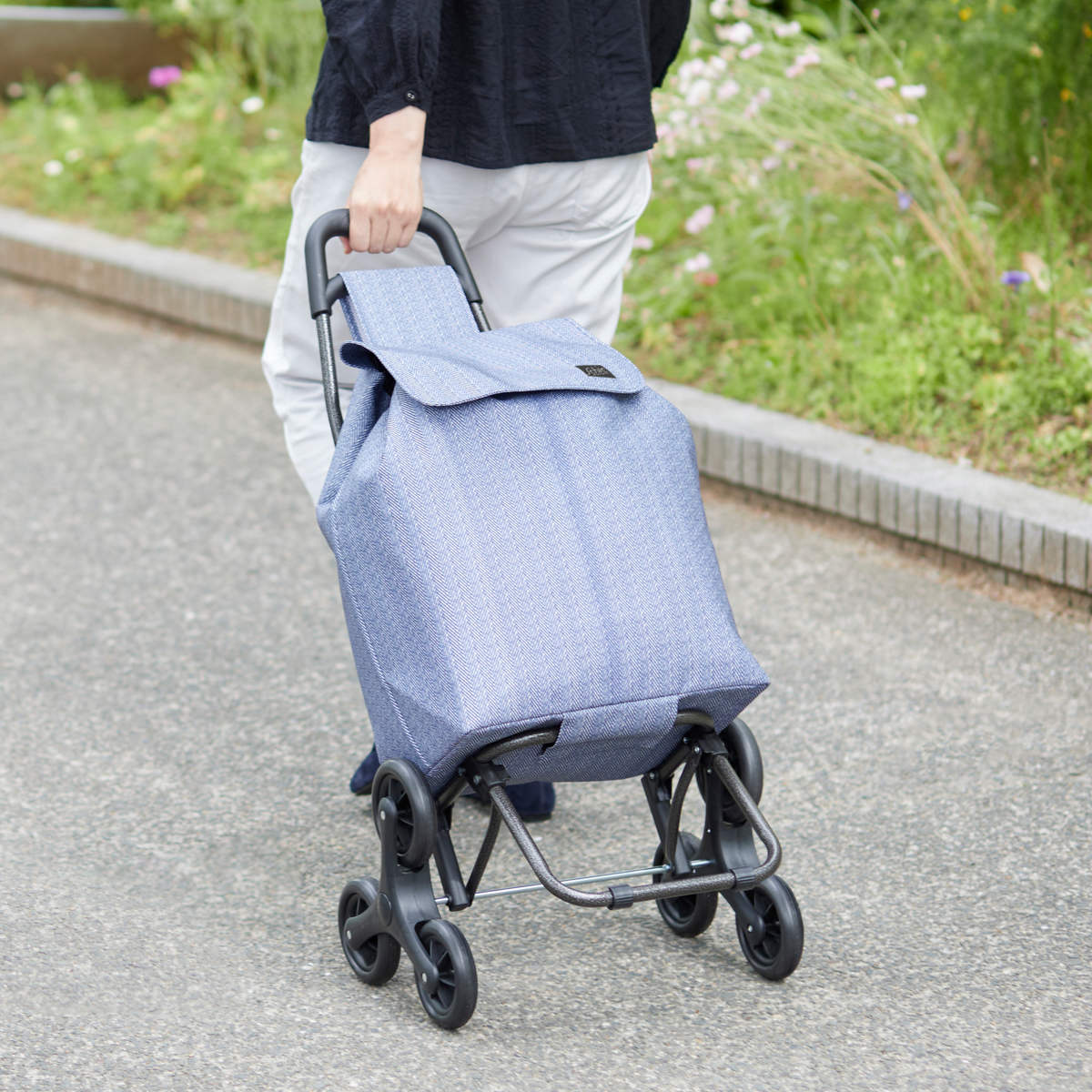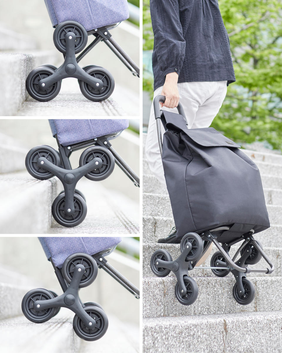 まとめ買いに便利なバッグ付きキャリーカートです。3輪タイヤが回転して補助してくれるので、引っ張るだけで段差や階段も楽にのぼれます。
