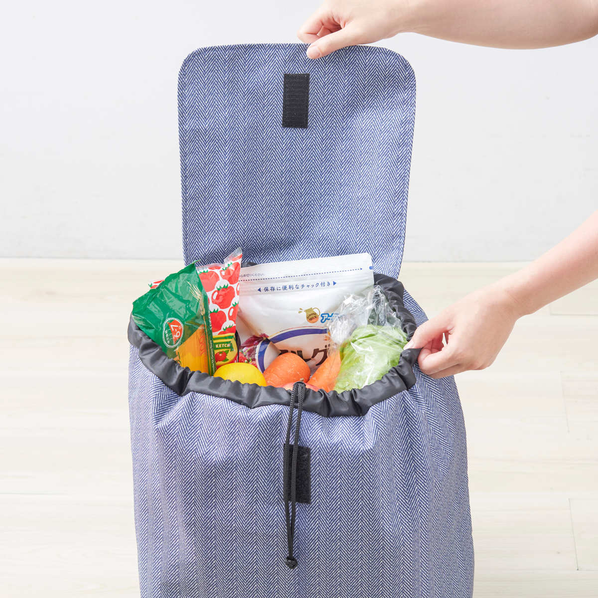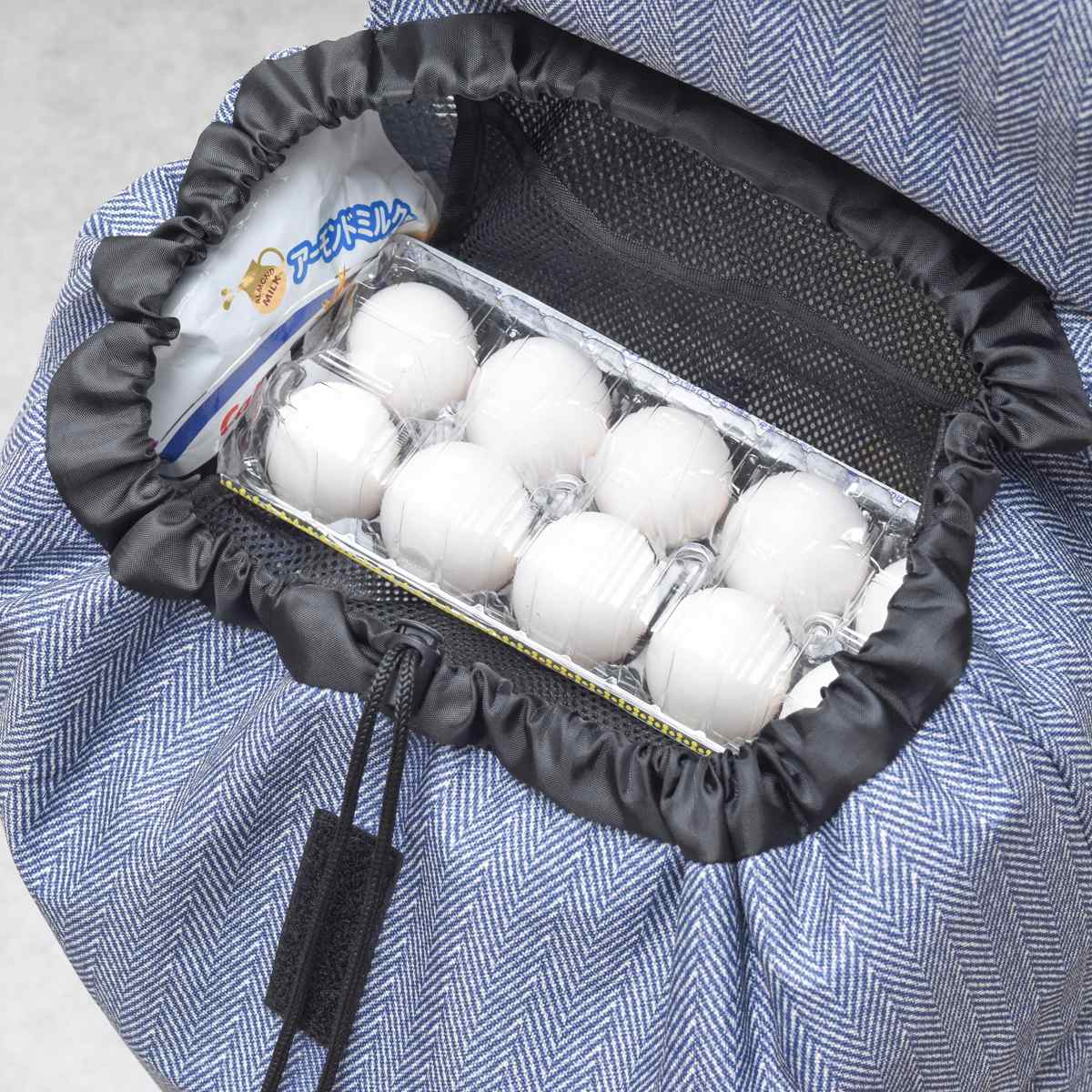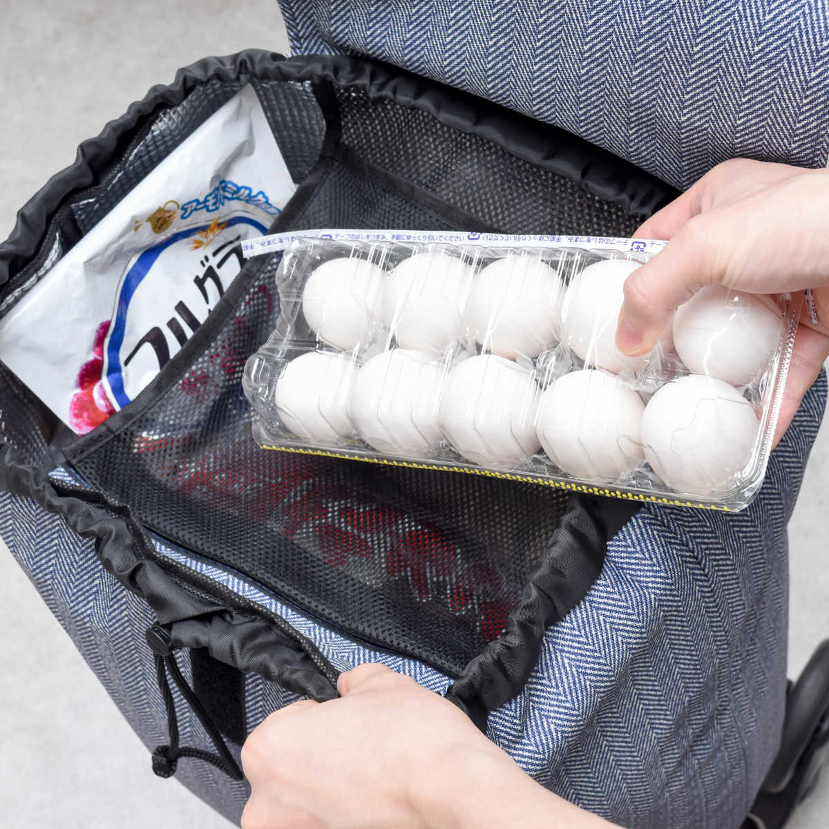 バッグの内側にハンモック付きです。割れやすい卵や柔らかいパン、潰れやすい果物などを保護して持ち運べます。