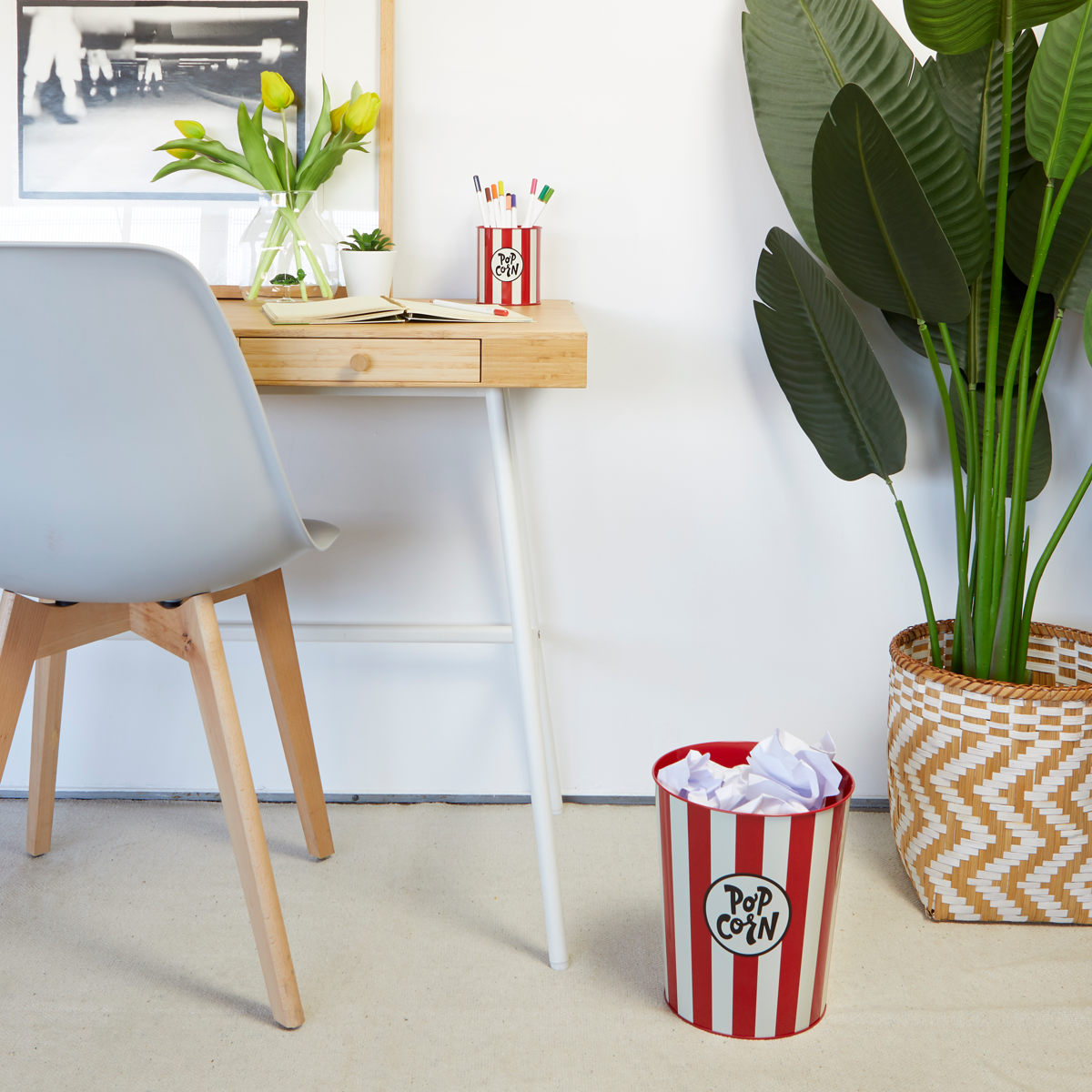 赤と白のストライプ柄に「POP CORN」のロゴが入ったデザインは、まるで映画館のポップコーンカップのよう。置くだけで空間が明るくなり、インテリアのアクセントになります。