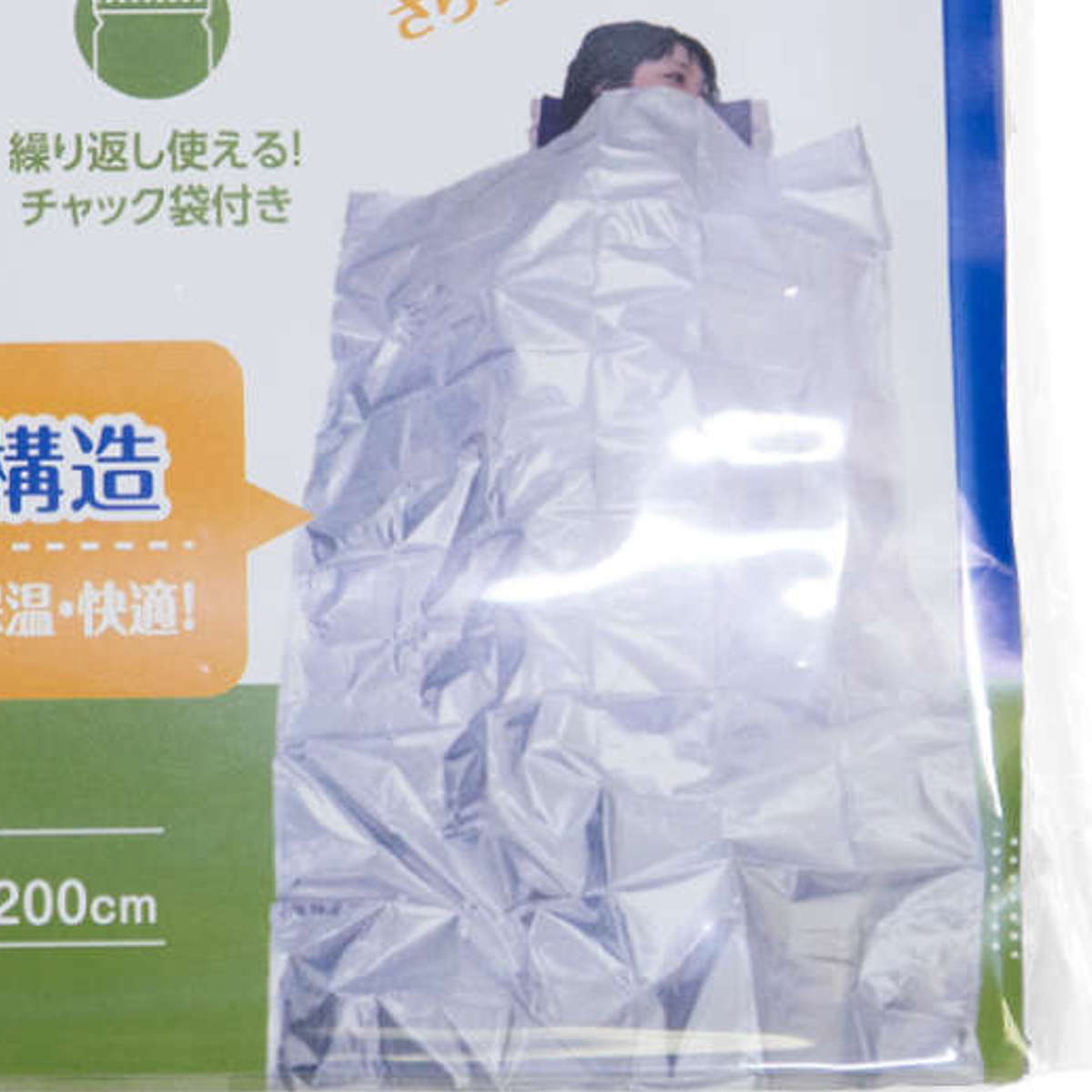 災害時やアウトドアで活躍するエマージェンシー寝袋です。約98×200cmの大判サイズで、寒い時期でも全身をしっかり包み込めます。