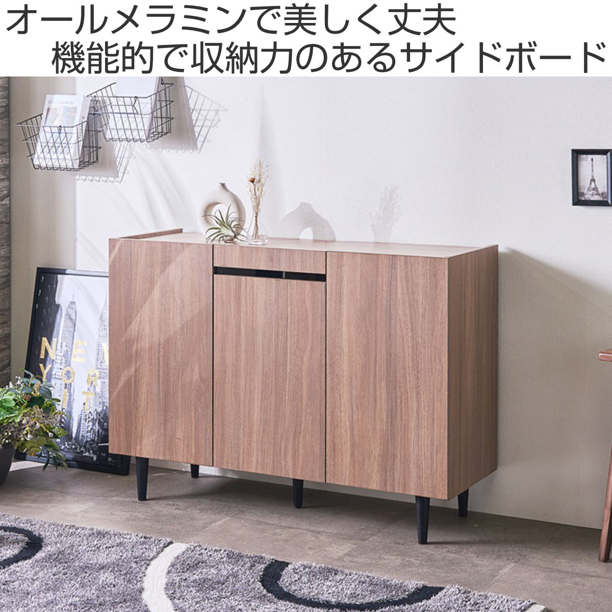 美しく丈夫なオールメラミンのサイドボードです。ナチュラルなデザインが空間の質を引き上げ、みんなが集まるリビングにお洒落なアクセントを加えます。背面は化粧仕上げが施されており、細部まで手を抜かず、丹精込めて製造されています。