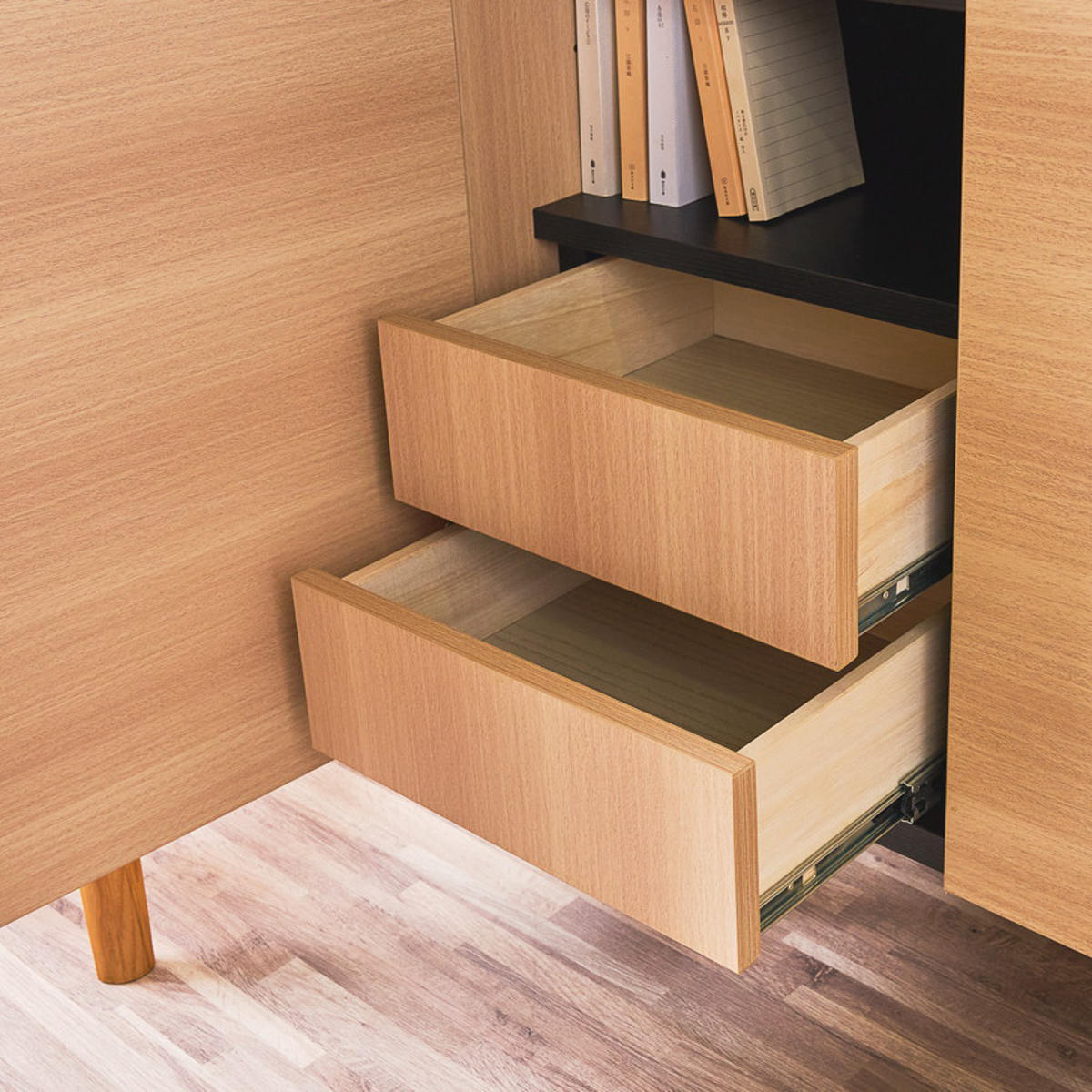 - 天板・前板・側板:メラミン樹脂繊維板 脚:天然木