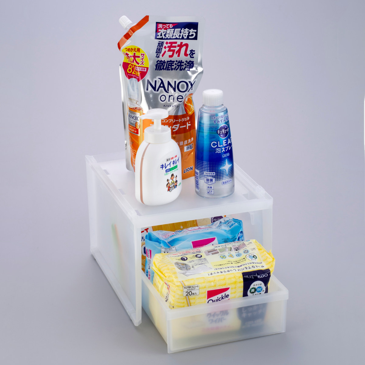 エクストラ:ラック1個を逆さに設置し引き出しを上に乗せることで、背の高い洗濯洗剤や大容量パックを下段に収納