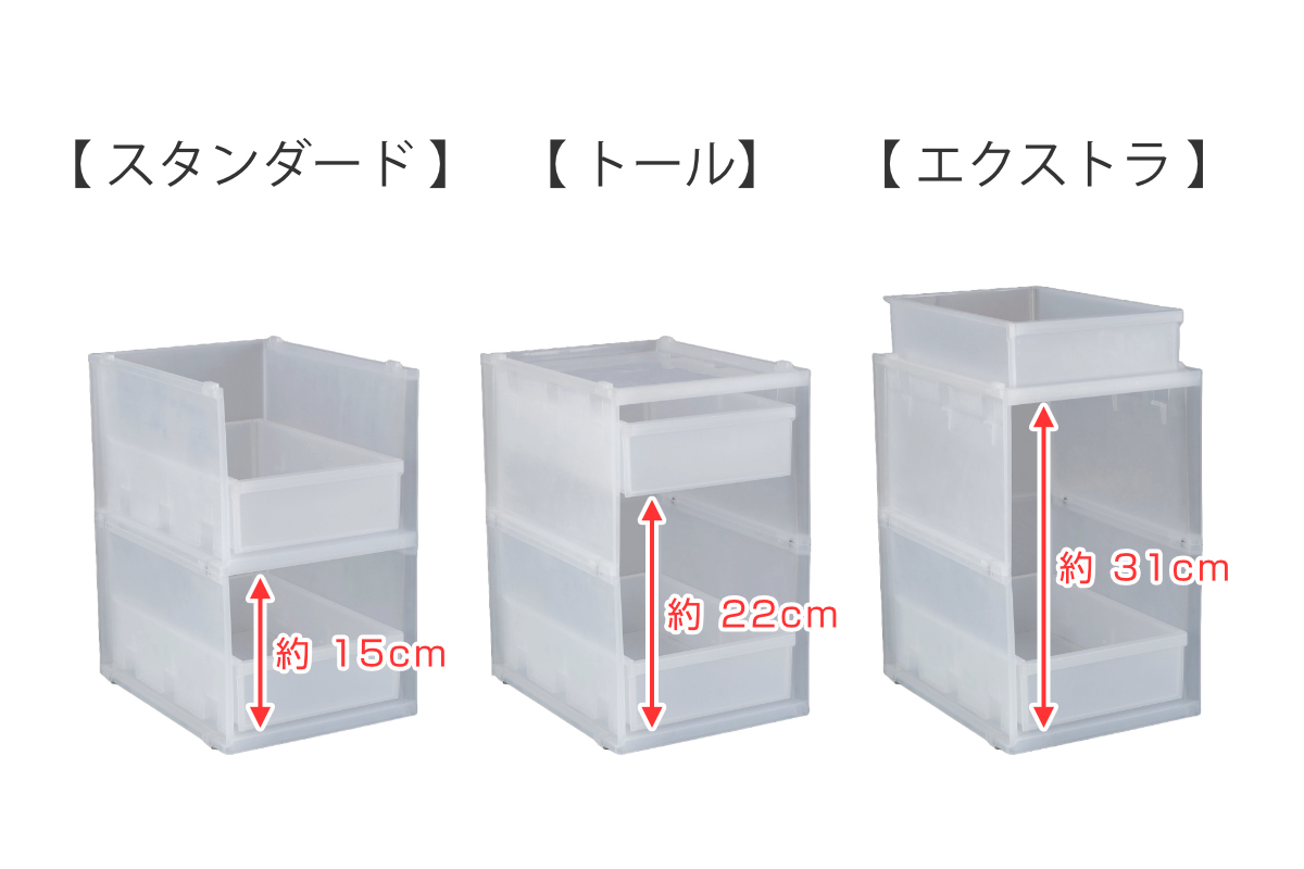 ラックを2個使えば、さらに使い方の幅が広がります。スタンダード・トール・エクストラの3通りの組み合わせで、無駄なくスッキリ収納可能です。