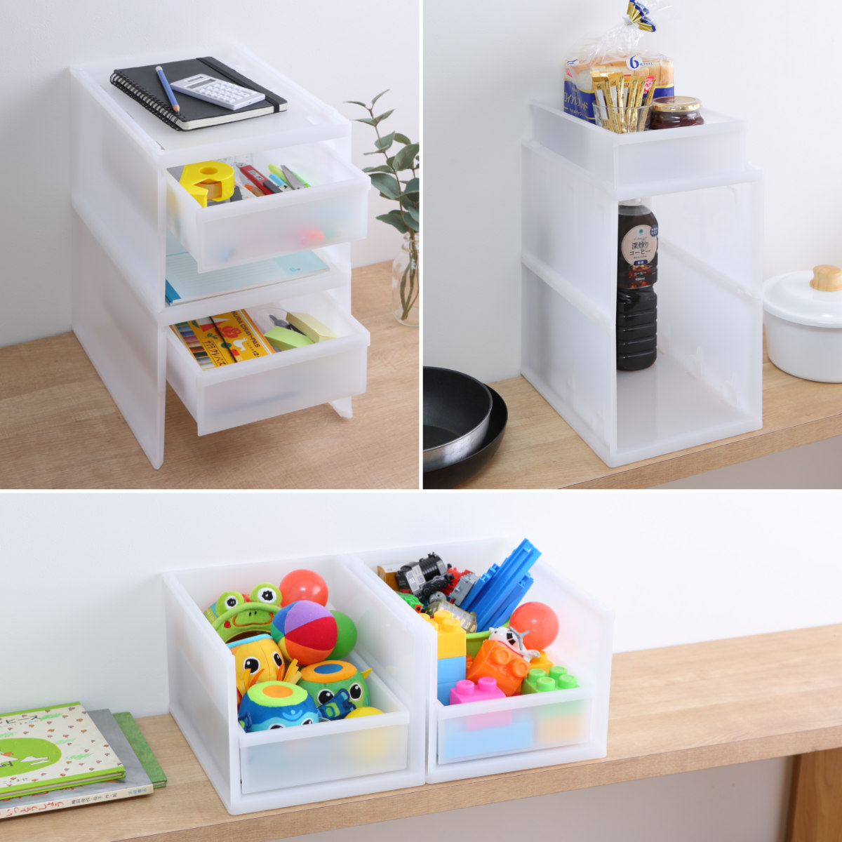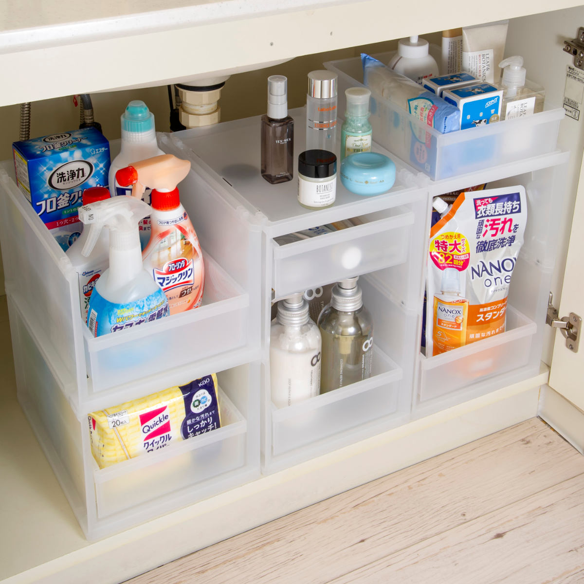 ラックと引出しを自由に組み合わせて使えるので、洗面下だけでなく、デスクまわりやキッチン、リビングの小物整理にも活躍します。アイデア次第で用途が広がる便利なラックです。