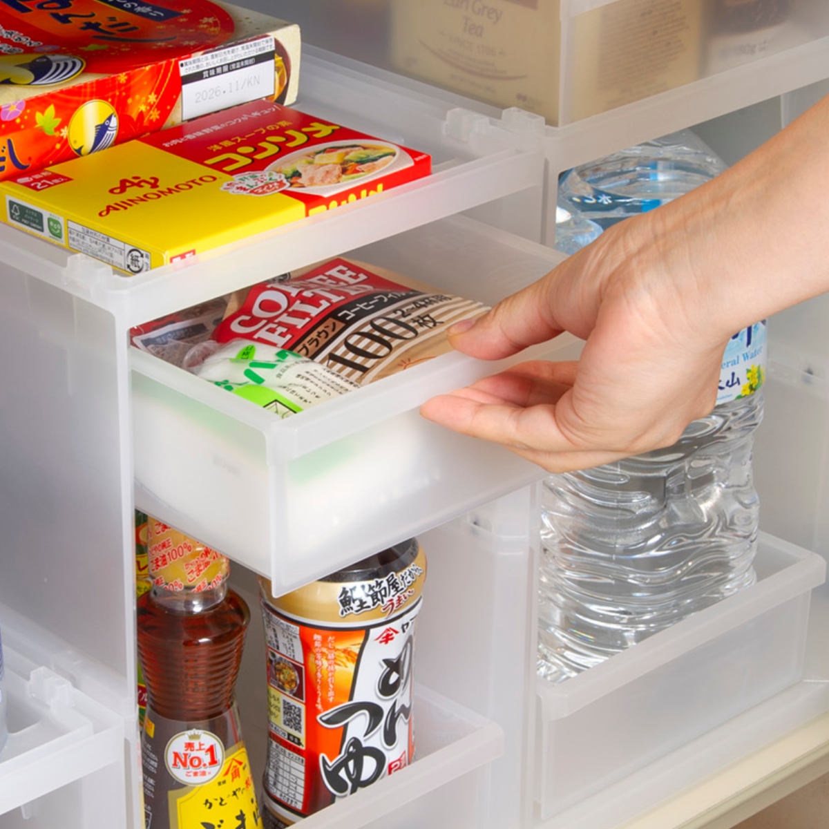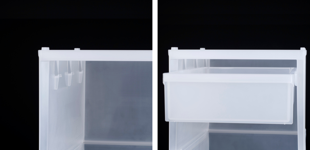 引き出しは本体のスライドレールに差し込むだけで簡単にセット可能です。開閉もスムーズで奥の物もラクに取り出せます。