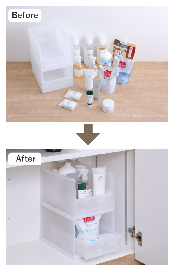 トール:ラック1個を逆さに設置して引き出しをセット。詰め替えパックやスプレーボトルを収納
