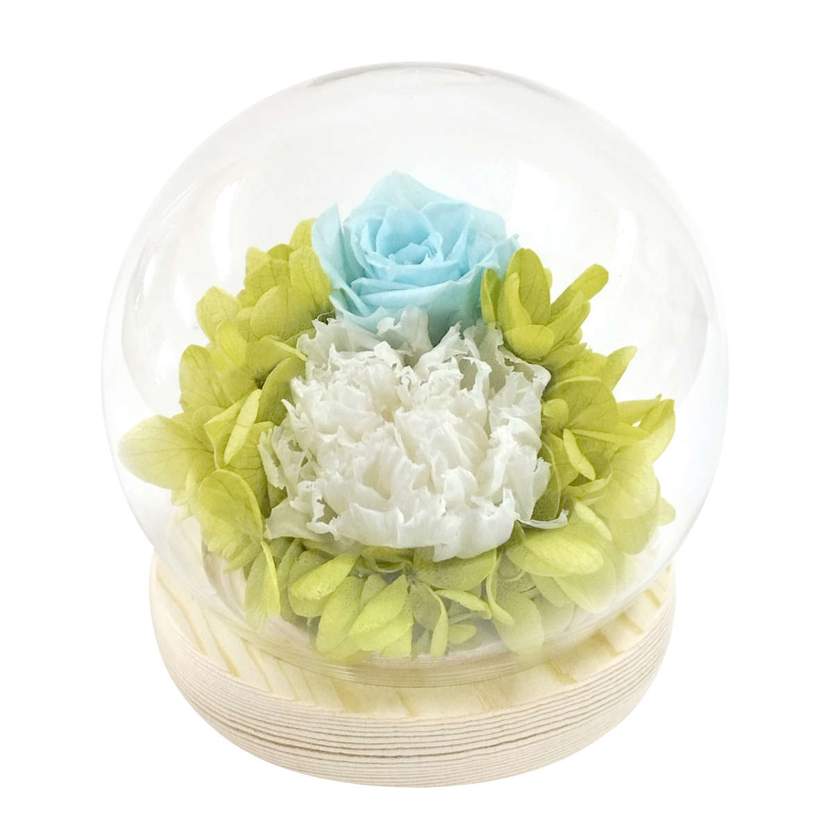 ころんと丸いガラスドームに包まれた、上品なお供え用プリザーブドフラワーアレンジメントです。片手で持てるほどの軽さとサイズ感で、コンパクトなお仏壇におすすめです。