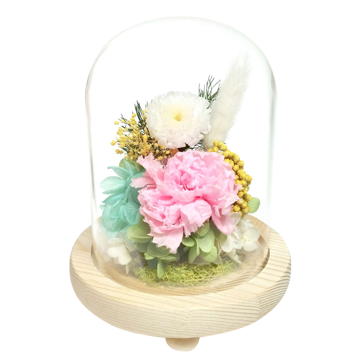 | 材質 | プリザーブドフラワー、アレンジ用スポンジ、ガラス、木製台座 |