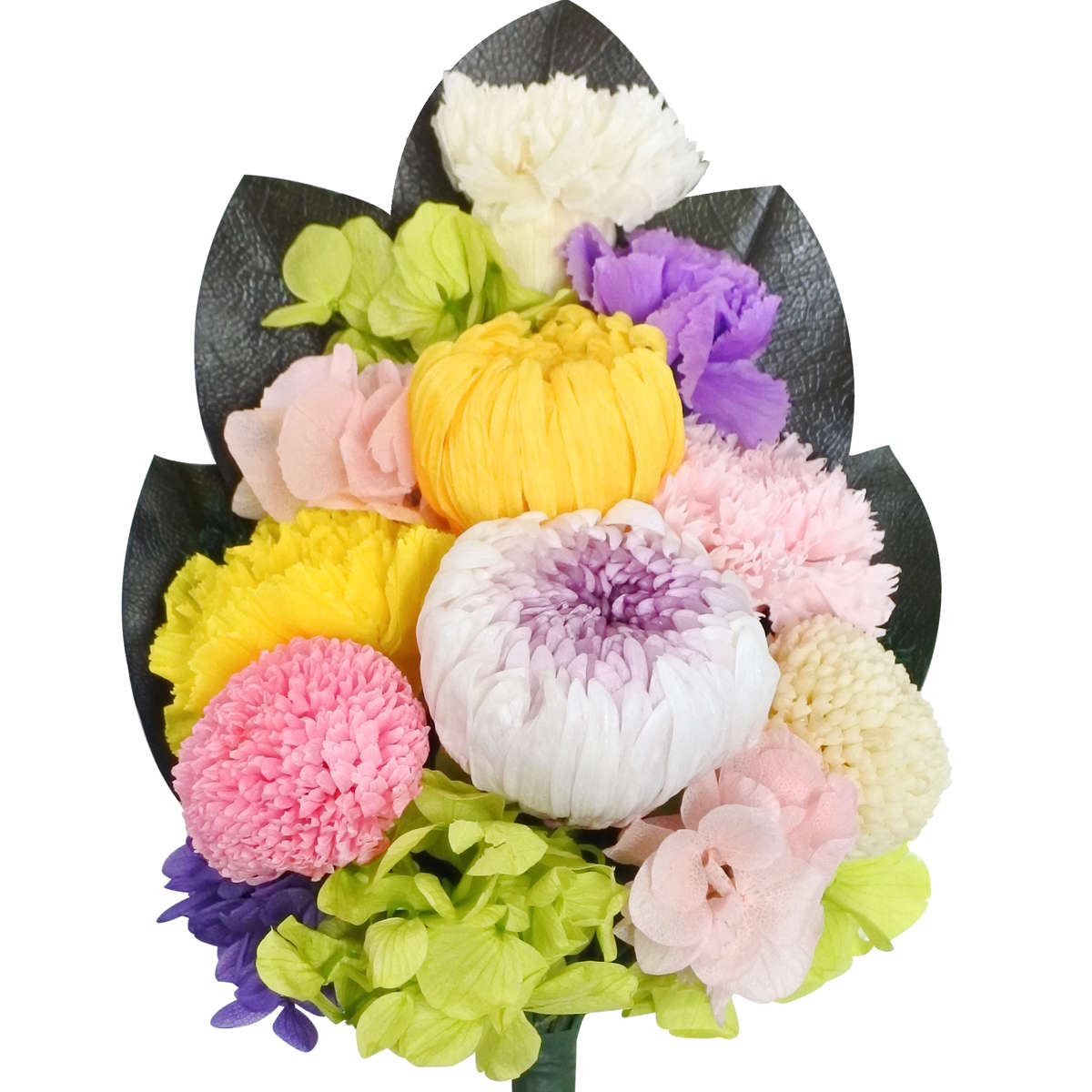 清々しい色合いとしっかりとした存在感が魅力の仏花の中サイズです。水やり不要のプリザーブドフラワーが美しさを長く保ち、故人とのつながりをそっと感じさせてくれます。