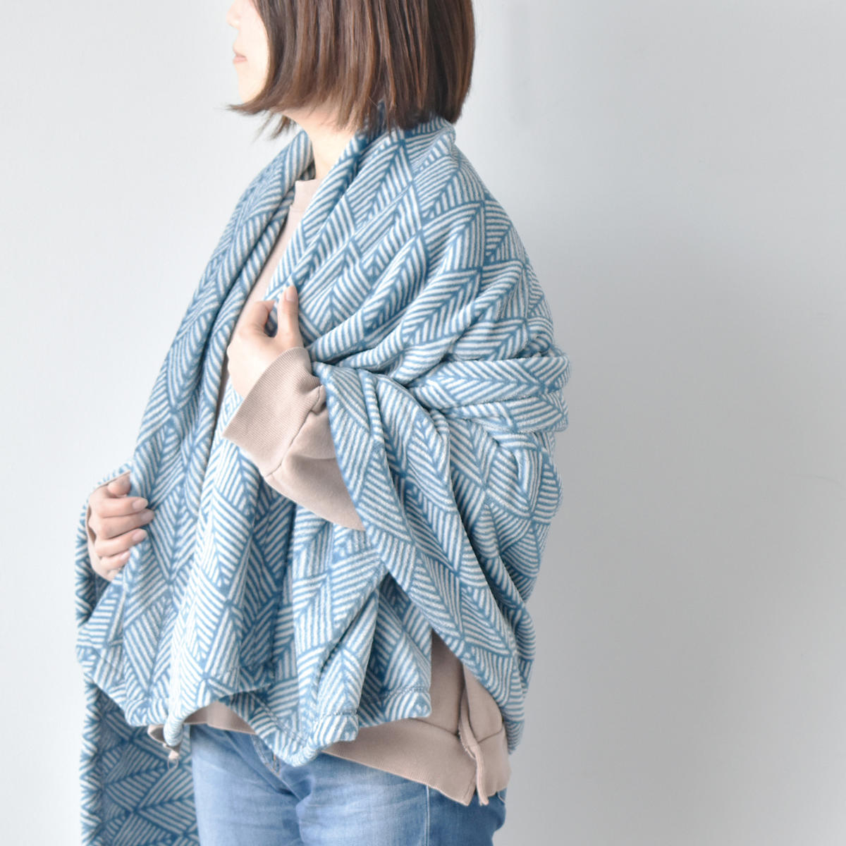 一枚仕立てでふんわり軽い仕上がりに。うら面も同じデザインになっています。体をしっかり包み込んでくれる大きめサイズです。