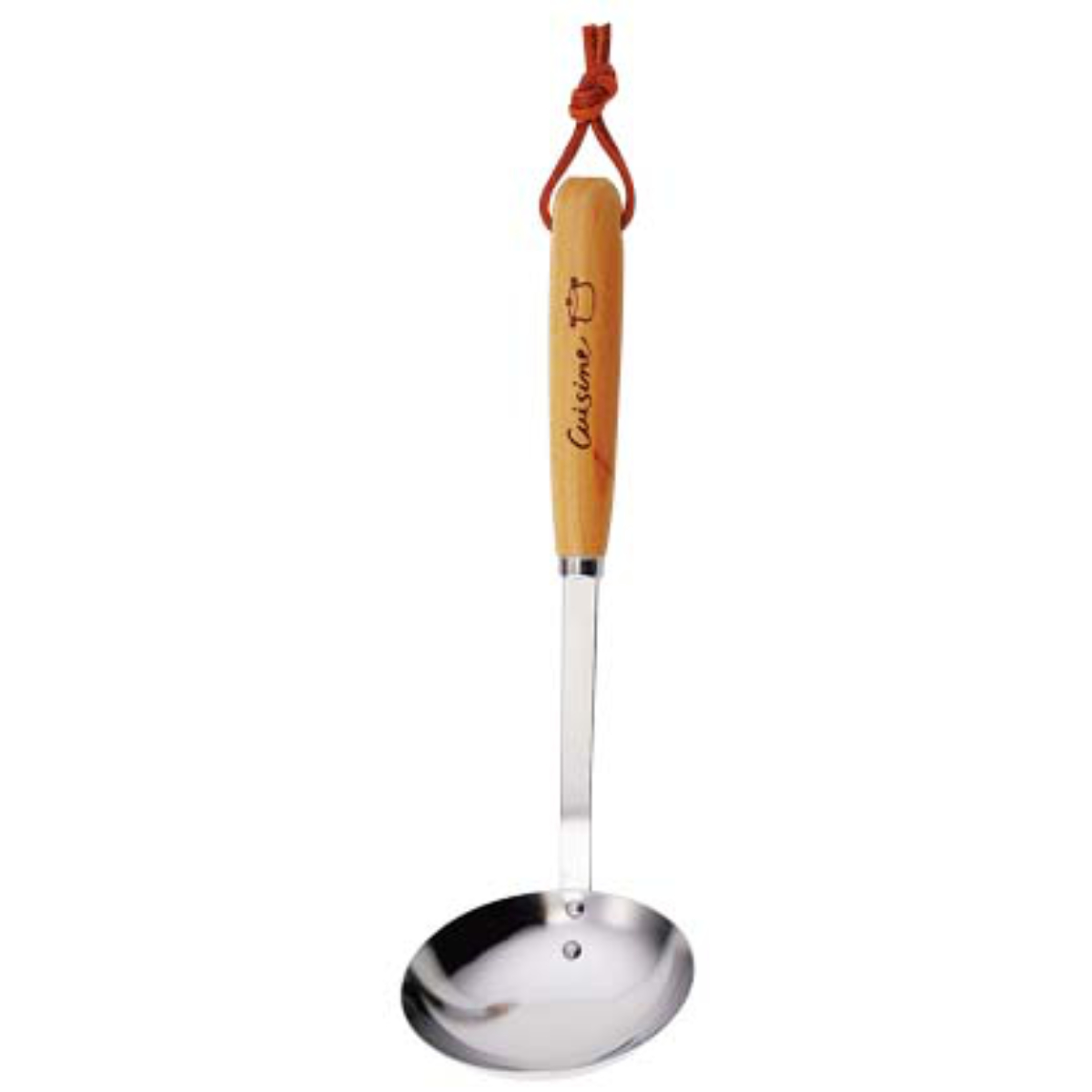 木柄の取っ手は手にやさしくフィットし、自然素材ならではのあたたかみを感じられます。やや小さめの卓上サイズで、スープの取り分けや鍋料理のサーブに便利です。