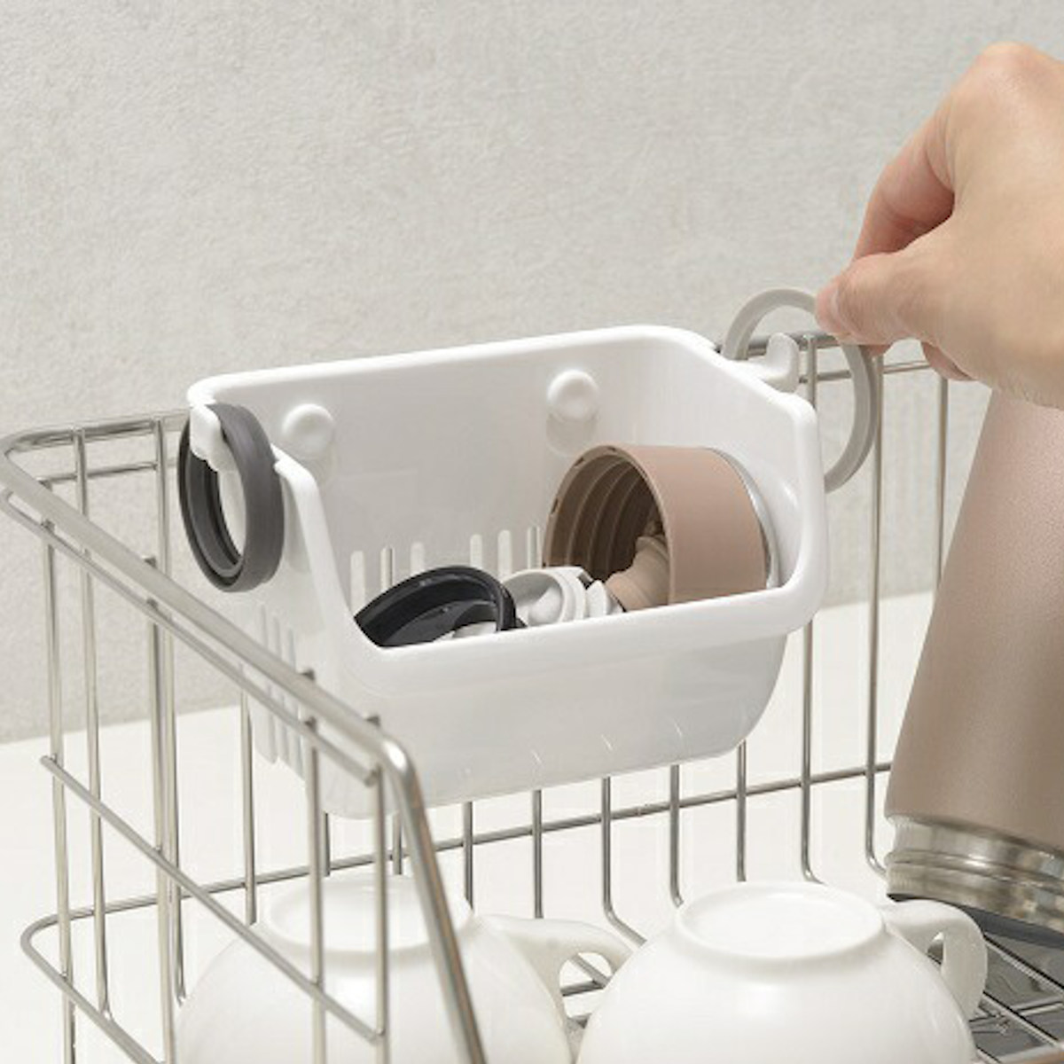 カゴの両サイドにはフックが付いていますので、パッキンなどを引っ掛けておくことができます。マグの飲み口やパッキン、ベビー用マグなどこまごまとした小物の乾燥に便利にお使いいただけます。