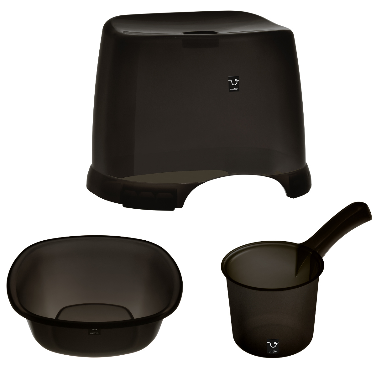 落ちついたブラックのクリアカラーがお洒落なバスアイテム3点セット(湯おけ、手おけ、風呂椅子)です。揃えると統一感のあるバスルームになります。