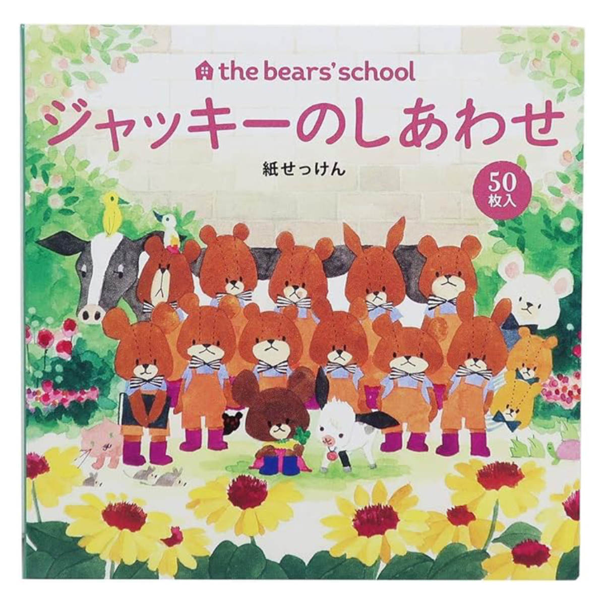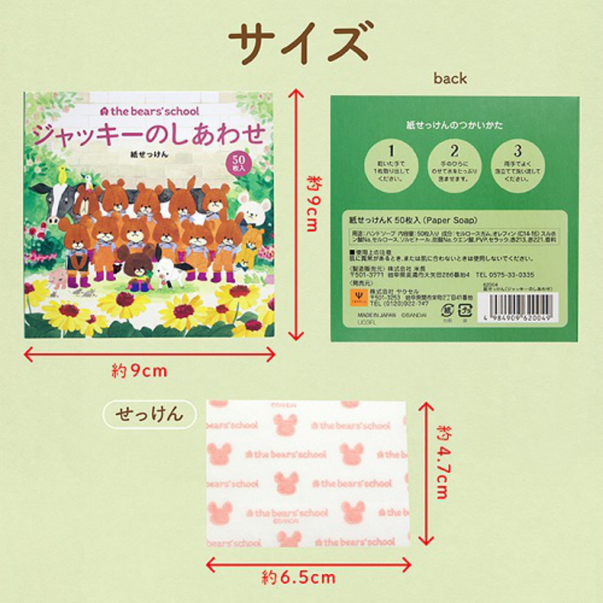持ち運びに便利な紙せっけんです。1枚ずつ使えるので、外出先やキャンプ、学校などで手軽に手洗いができます。水に触れるとすぐに泡立ち、しっかり洗えて衛生的です。くまのがっこうのかわいいデザインで、お子さまにも喜ばれるアイテムです。グリーンフローラルのやさしい香りで、手洗い時間を心地よくしてくれます。安心の日本製・50枚入りです。