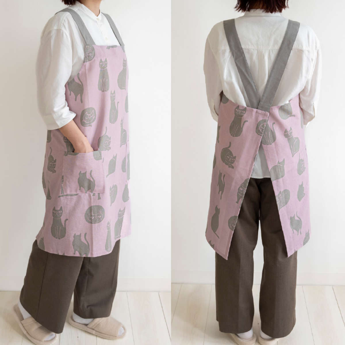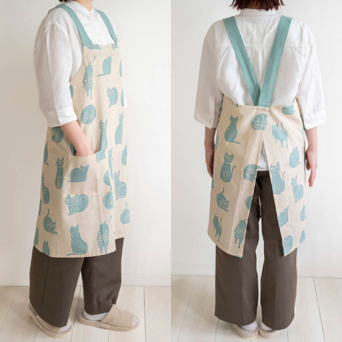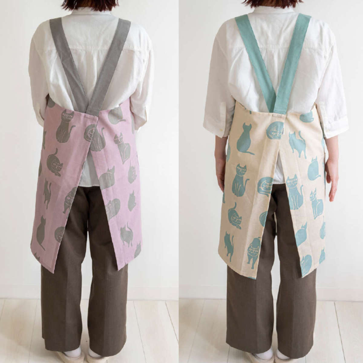 かぶるだけでサッと着られる、着脱しやすいバッククロス仕様。毎日使うエプロンだからこそ、ストレスなく着られる快適さが嬉しいポイントです。