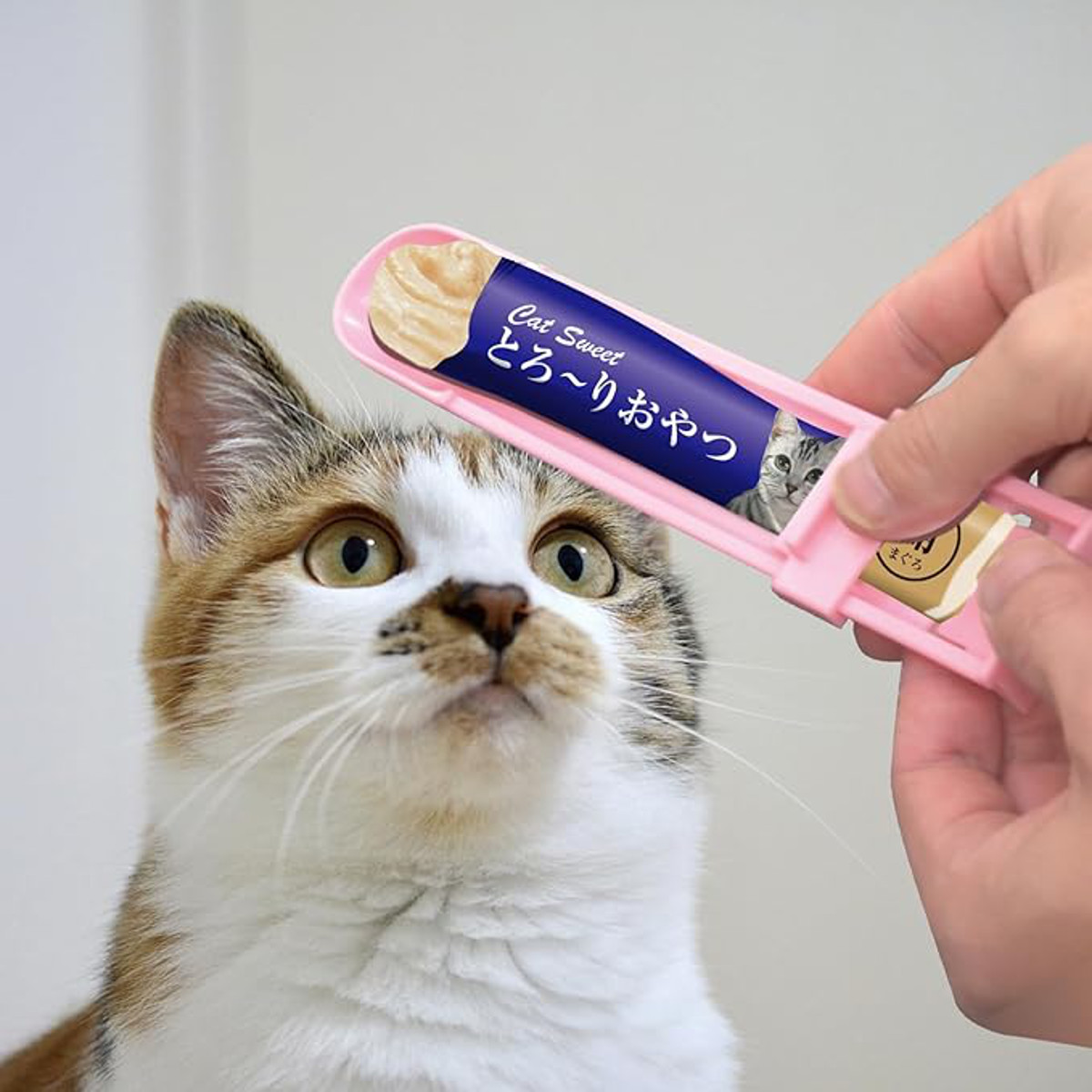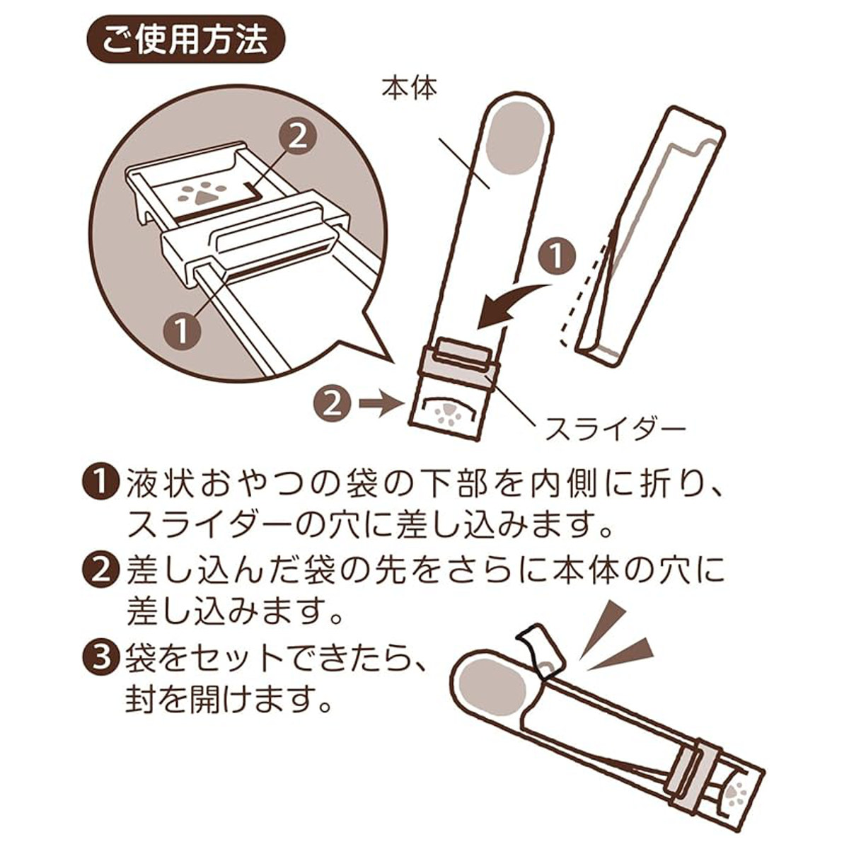 ペットのネコや犬に液状おやつをあげるスプーンです。細長い袋に入った液状おやつを、スライダーで簡単に絞り出しできて、おやつ袋の誤食を防止できます。ペットとふれあいながら、おやつタイムを楽しめます。