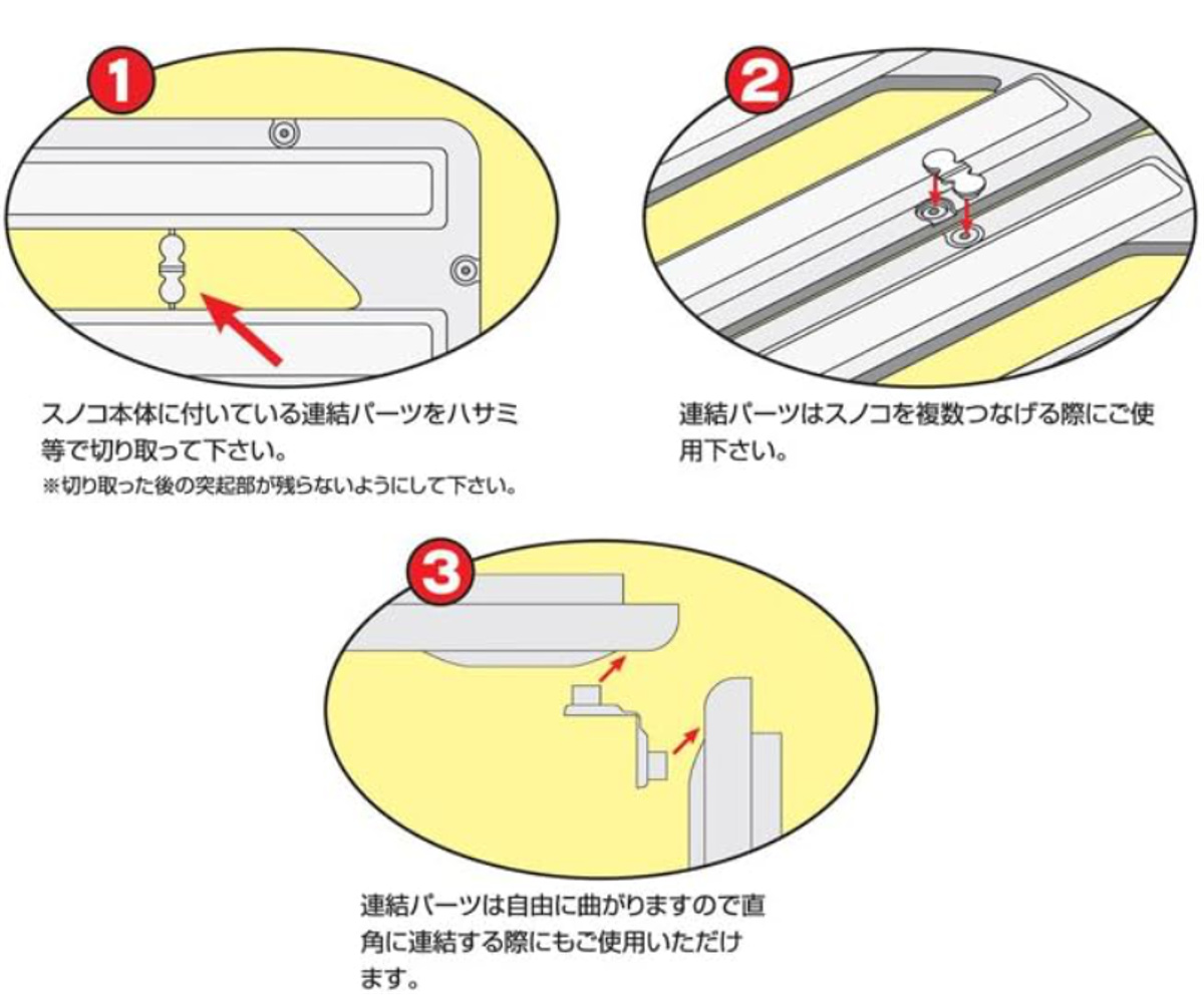 連結パーツは自由に曲がるので直角に連結することも可能です。床面だけでなく、側面にも設置できるため、空気の流れをより確保できます。