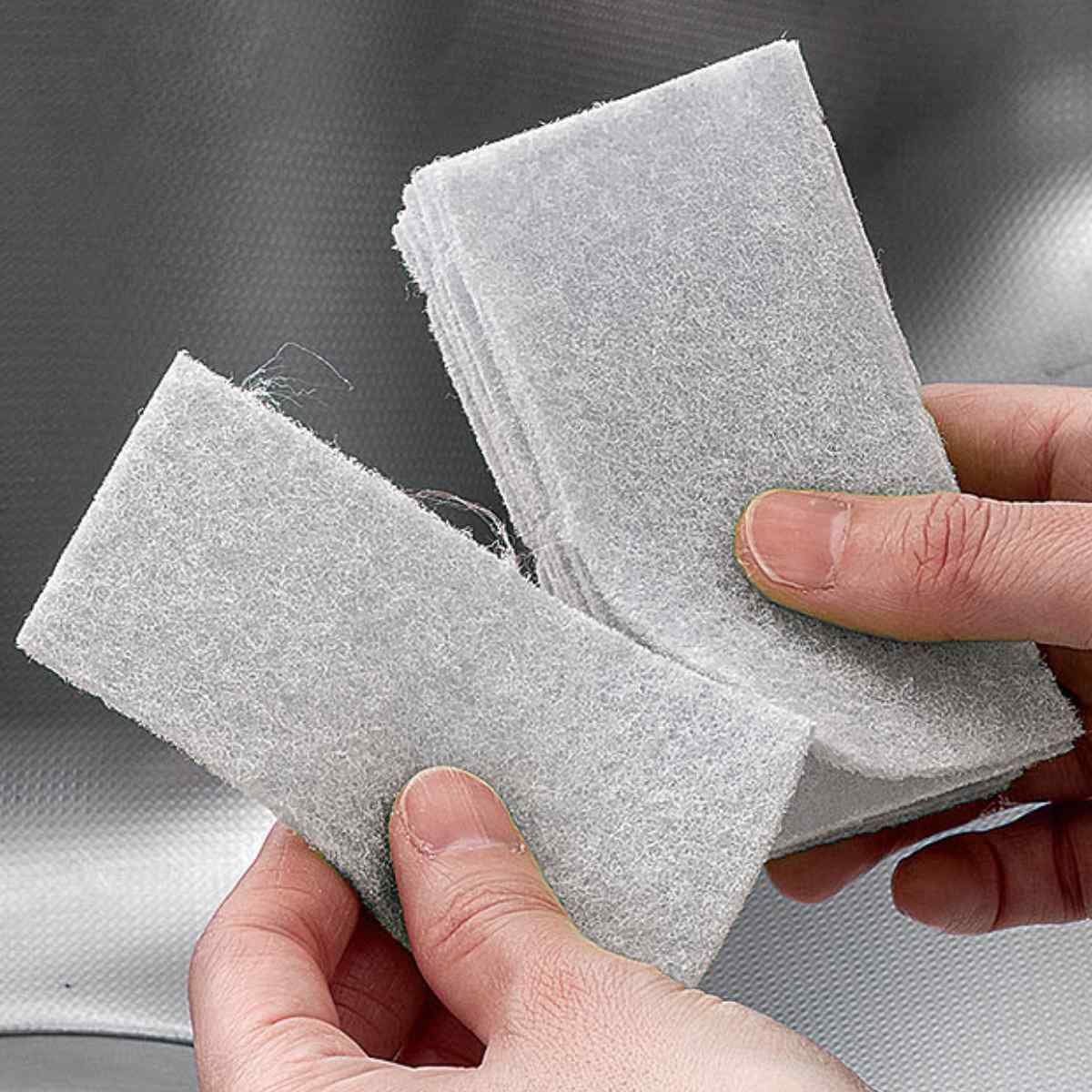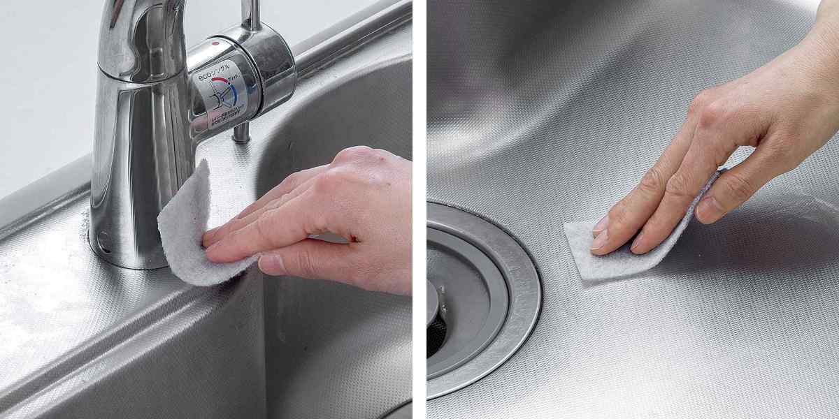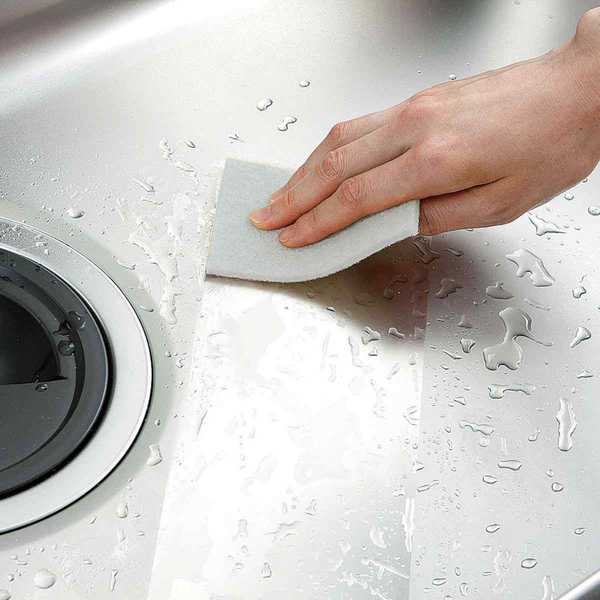 水を含ませるとクエン酸が溶け出し、汚れを分解させてしっかり落とします。鍋やフライパンはもちろん、シンク・蛇口・キッチンまわりを丸ごとキレイに洗えます。冷蔵庫の中や電子レンジなど洗剤を使いたくない場所の掃除にも便利です。