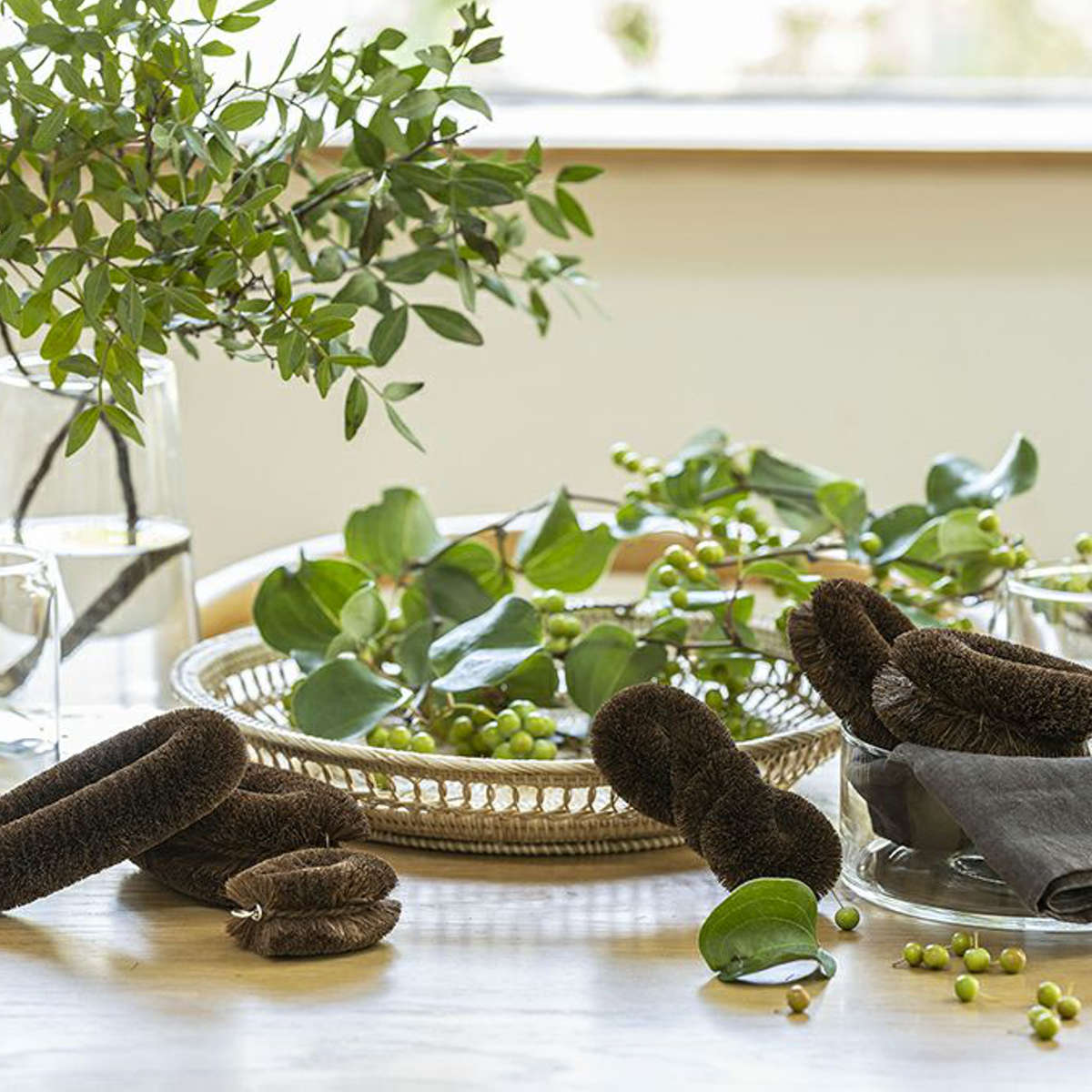 棕櫚たわし極〆シリーズは、棕櫚の皮から採れる繊維を贅沢に使い、和歌山の熟練職人が一つひとつ手作業で仕上げています。用途に応じて選び抜かれた繊維を適所に使い分けており、水をはじきやすく乾きやすいのも特長です。