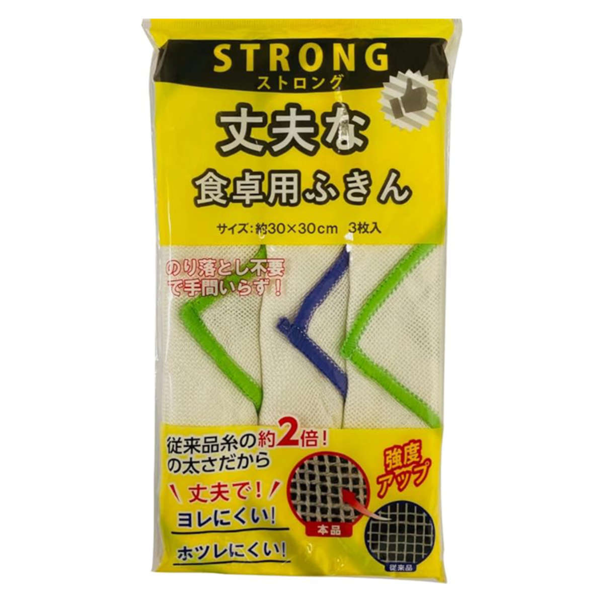 従来品の約2倍の太さの糸を使用し、ハリのある丈夫なふきんです。破れにくく、ヨレにくい構造で長く使えます。のり落とし不要の加工済みタイプなので、開封後すぐに使えます。洗い替えにも便利な3枚入りです。