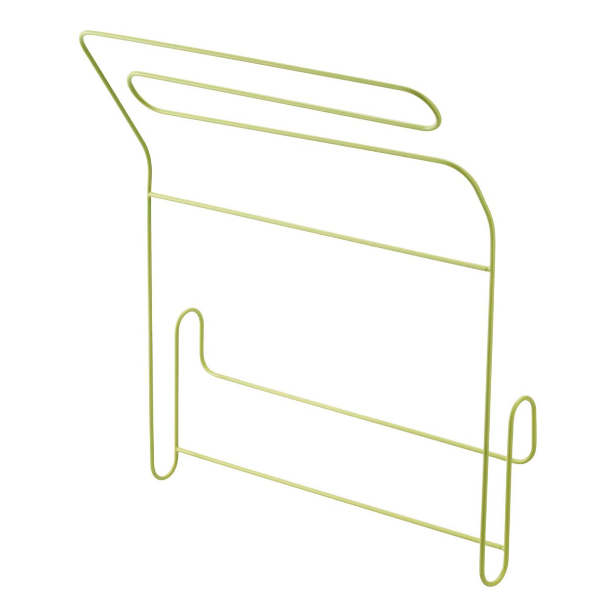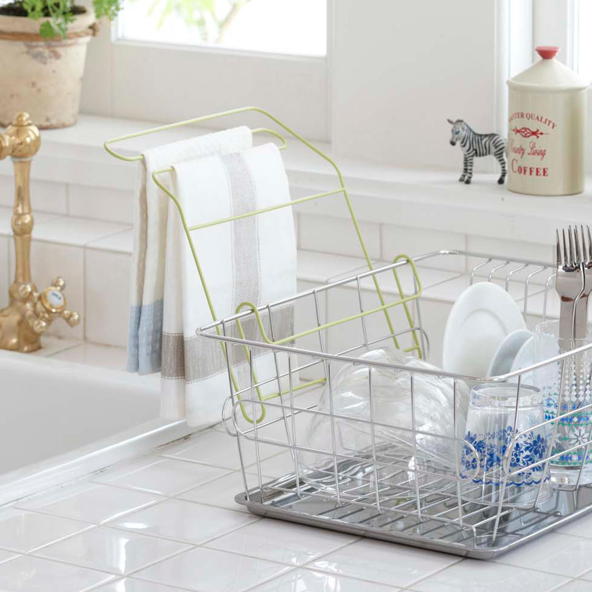今お使いの水切りカゴに引っ掛けるだけで使える外付けタイプの布巾ハンガーです。食器拭きや台拭きの布巾を干すのに場所を取らずに便利です。