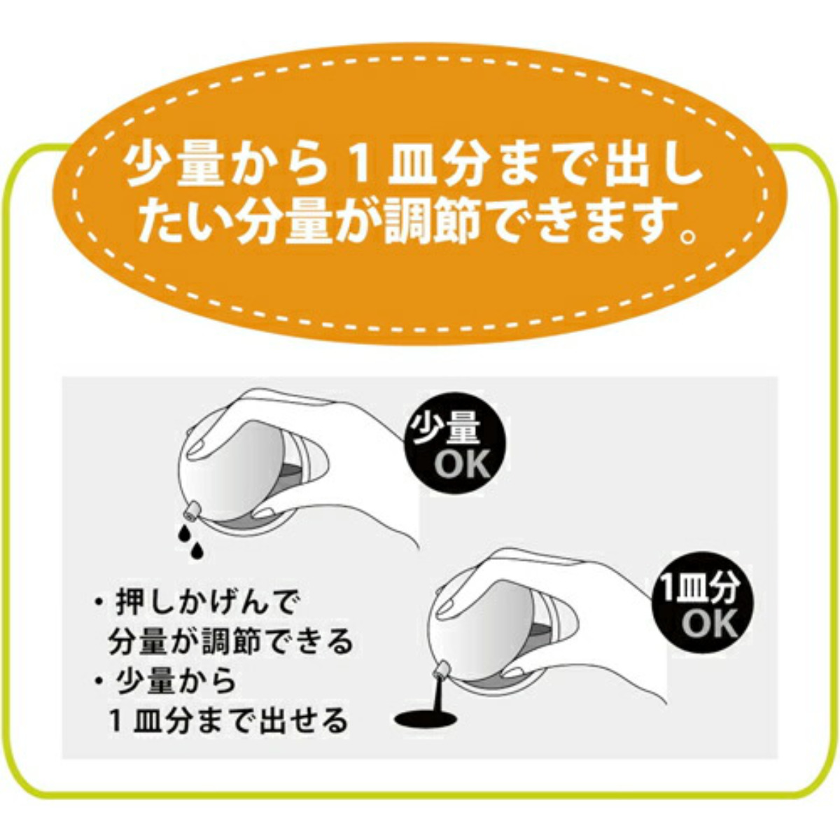 少量から1皿分まで、使いたい分量を調節できる70mlサイズの醤油さしです。押しかげんを変えるだけで、ほんの少しだけ垂らしたい時も、しっかり味付けしたい時も思いのまま。醤油のかけ過ぎを防げるため、調味料の節約や減塩にもつながります。