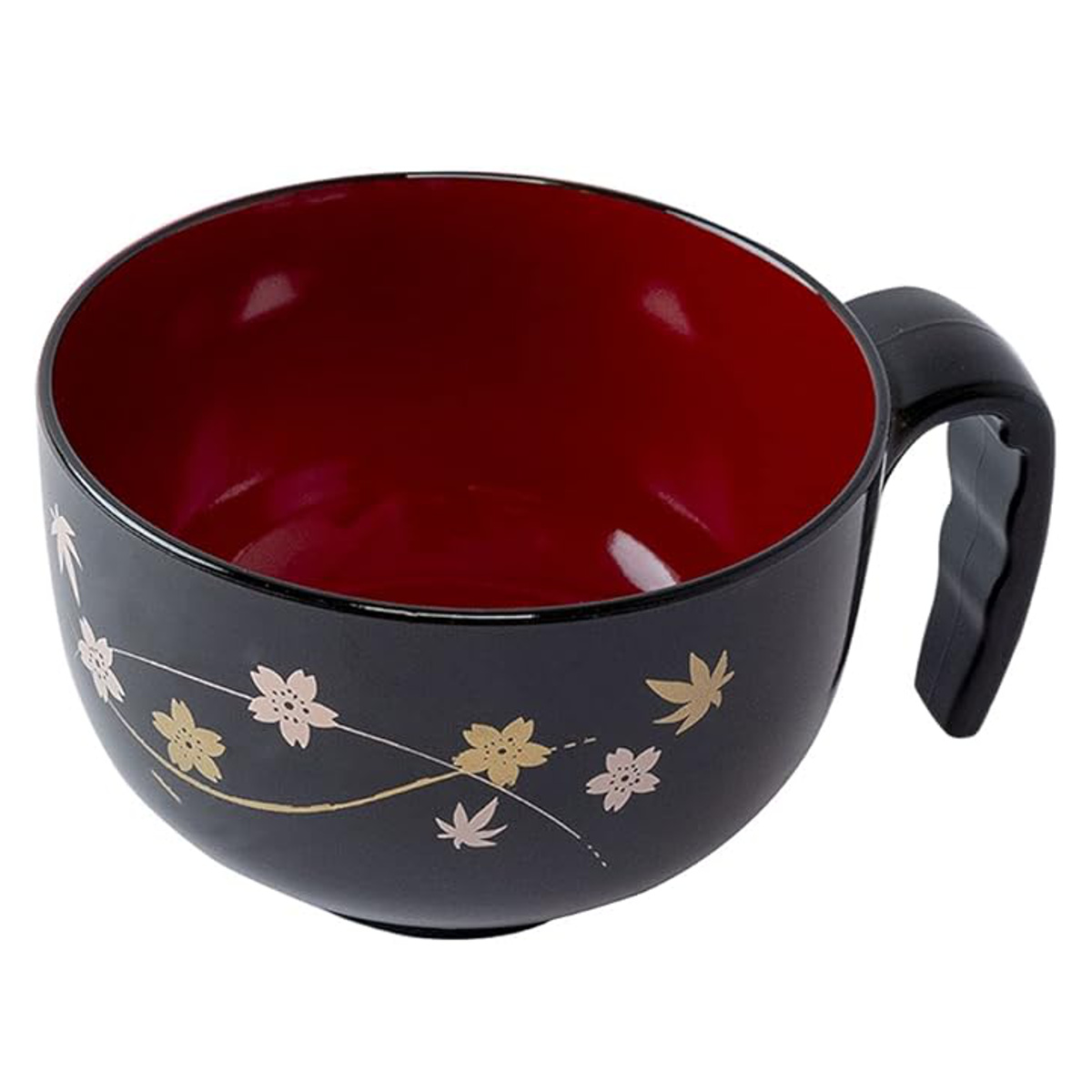 温かみのある和風デザインの茶碗です。太めのハンドルに手を差し込みやすく、軽い力でもしっかり持てるため、食事中の安定感を高めます。落としても割れにくい樹脂製のため、毎日の食事介助にも扱いやすいアイテムです。