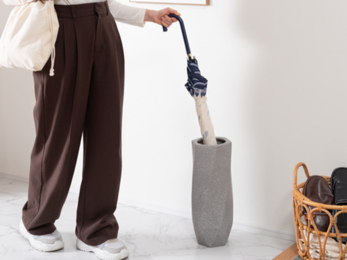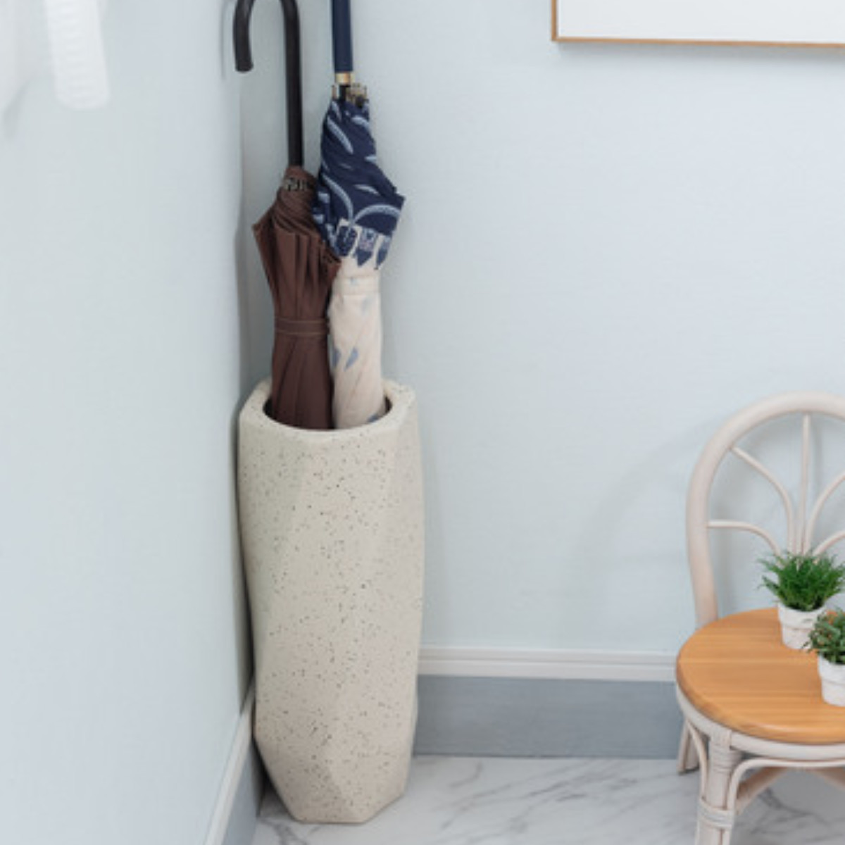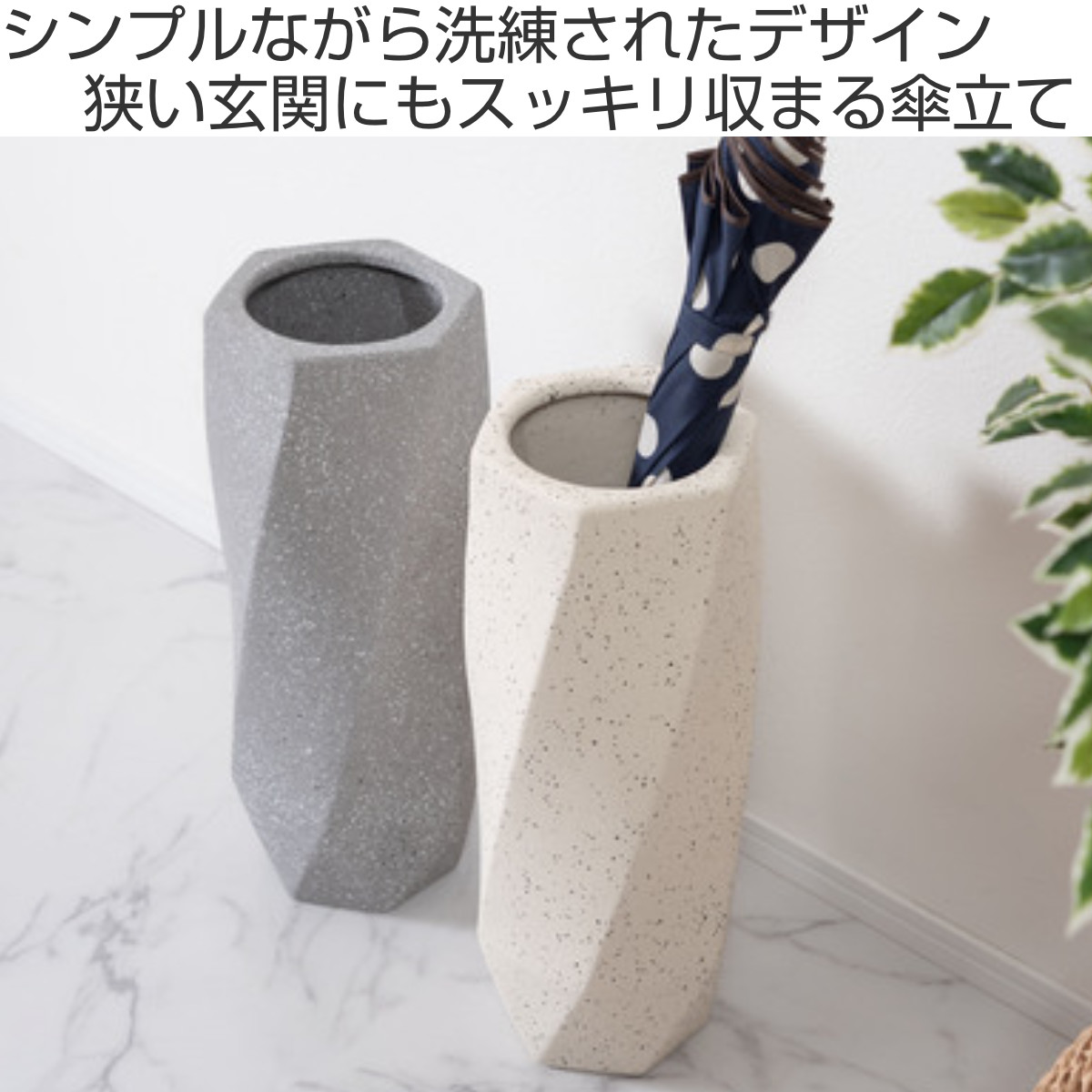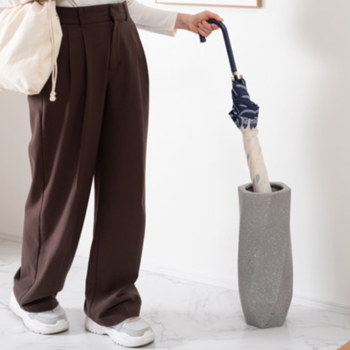 石のようなデザインが施されたモダンテイストな陶器製です。陶器は水に強く、濡れたままの傘を入れてもサビの心配がありません。また、重みがあるため安定感もあります。