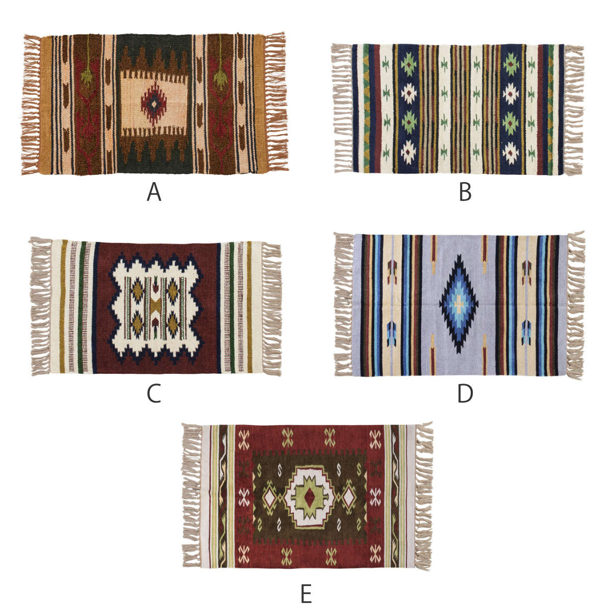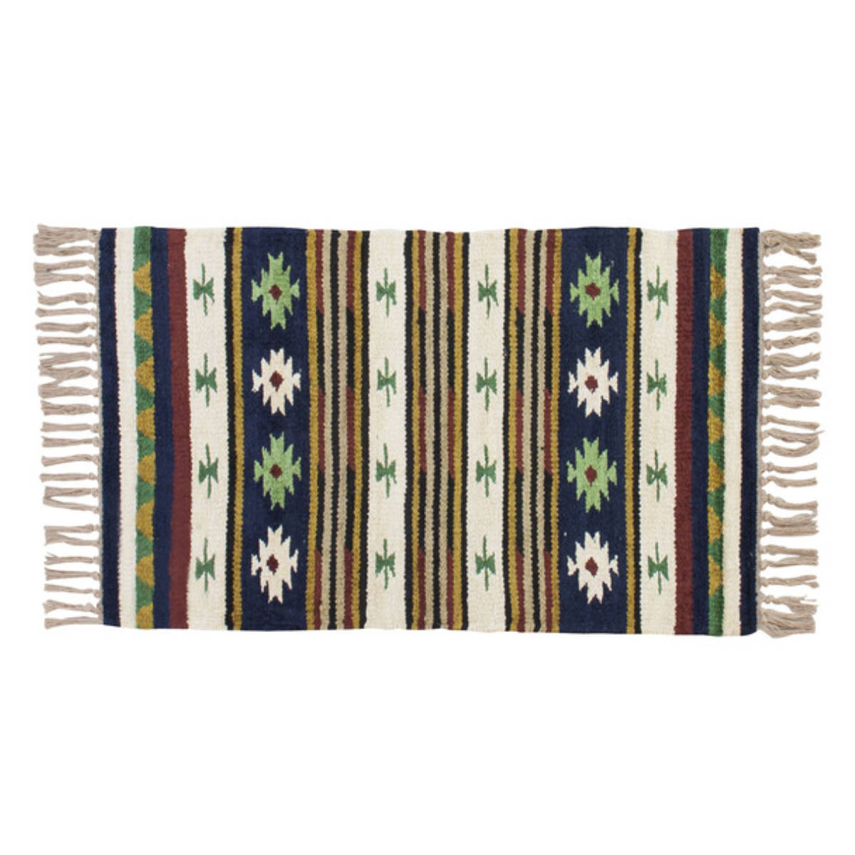 ハイセンスなキリム柄が目を惹く、玄関マット。レッド、イエロー、ネイビーなどカラフルな色合いで織られていますが、それぞれの色に深みをもたせることで空間の邪魔をせずインテリアを引き立ててくれます。