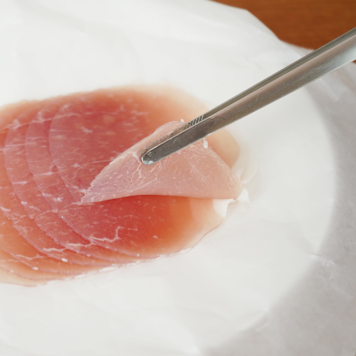 コンパクトで取り扱いやすいサイズのトングは、生ハムなどの薄い食材も先細の先端で1枚ずつ取り分けることができます。