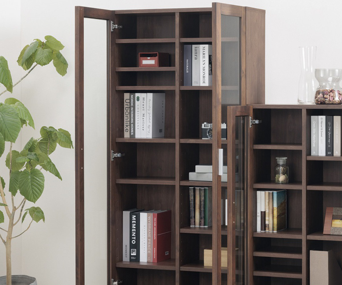 美しい木肌が特長のアルダー材を使用したガラス扉の本棚です。ガラス扉は、大切な書籍や趣味のコレクションなどをホコリから守ります。アルダー材は経年変化を楽しめ、長くお使いいただけます。